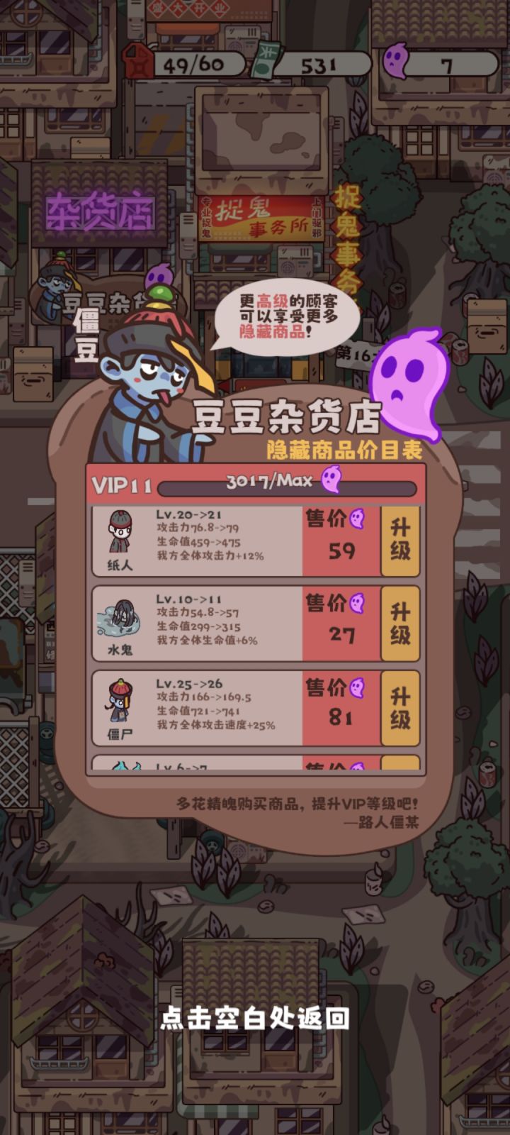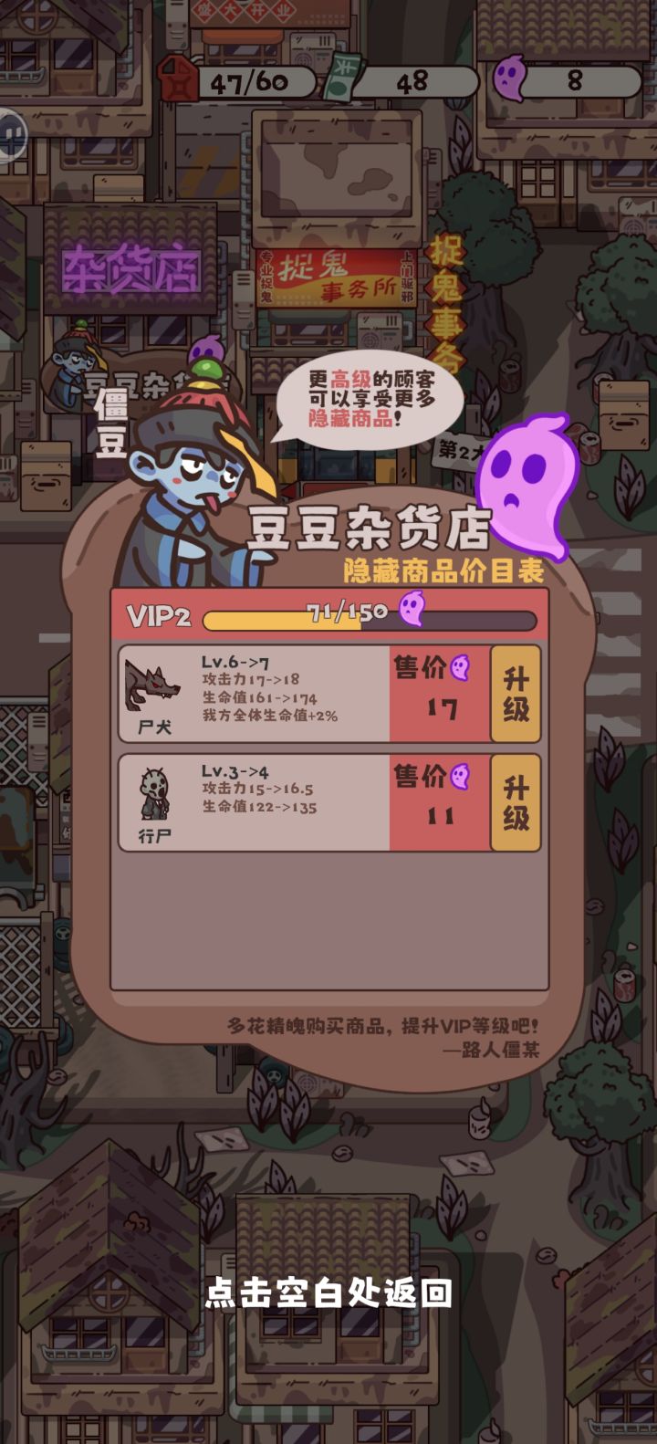 前期鬼物生狗和行尸就行,异鬼不太需要主要是把对面怪吸住放技能,钞票比魂有用蓝石其次黄纸一点用没有,然后正常打把僵尸刷出来,僵尸速度比较快再加上升级后的技能范围大伤害高对面棺材血薄,直接闪电战能过很多关(再看广告收益更高,不想看广告不要把主线刷太多,因为少打很多怪会亏一点收益,去刷无尽,这套打法前期可以省很多蓝石,后面遇见乘三可以刷很多蓝石走的更远),到这就主要升级僵尸(其他不是必须随便升升防一下空