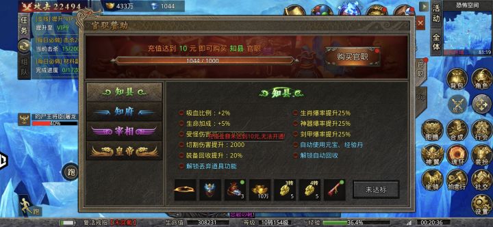 1: 小氪十元可购买知县官职,解锁自动回收,建议开通,因为游戏玩到后面大部分时间都靠挂机掉装备分解得元宝,开通自动回收可获得大量元宝。充值100可购买知府职位(比较鸡肋的一个充值额度,不建议)。充值三百可购买宰相职位(之后可以在商城里面购买沃玛号角,建立行会争霸天下由此开始),有中长期玩的意向的人建议开通。充值一千三可购买皇帝职位(要十万钻石,送一重神装袍)2: 游戏开区第一天建议购买转生投资,