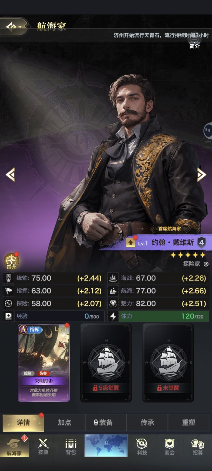 优秀的航海家曾发现了新航道。航海属性较低,不加航速,不海战就是废物。探险属性高得离谱,不愧为首席航海家