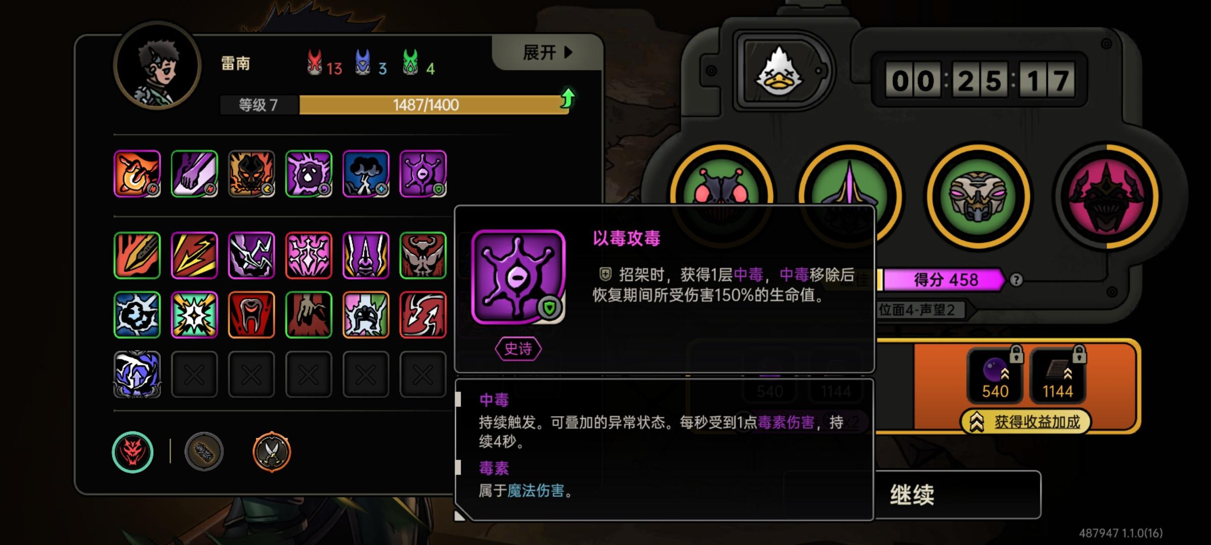 如图,这个“以毒攻毒”选完之后,不知道和那个东西联动还是有bug,我一个格挡,自己脑袋上的毒就开始飞叠,第一次子弹时间里叠到360层毒就爆了,我选看广告复活,第二次又是一个格挡,毒又飙升给自己秒了,这什么机制啊。