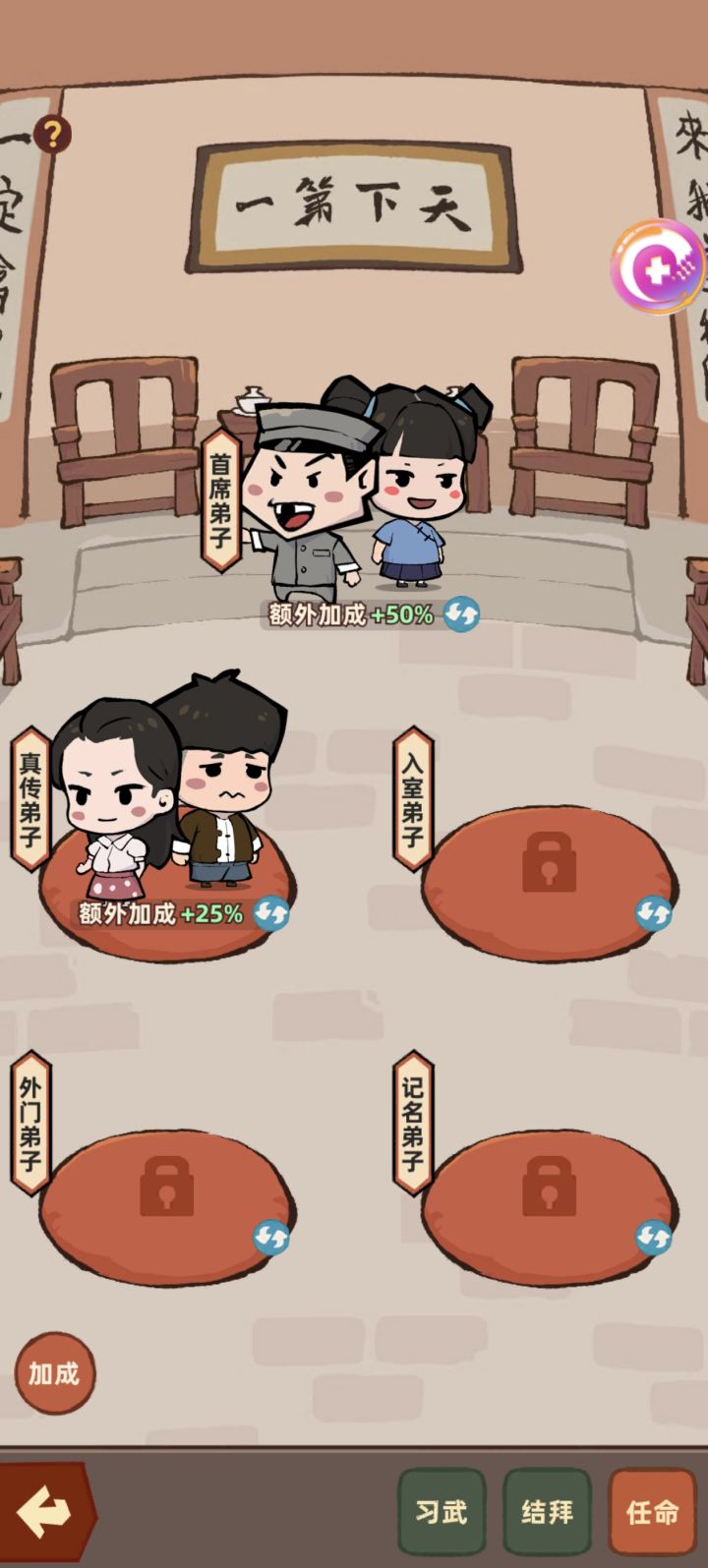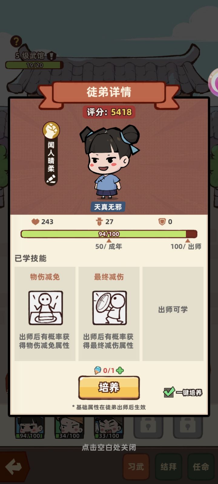 武馆培养弟子到底有什么用啊!!!我以为培养的每个弟子的属性都可以叠加的(毕竟给的也不多)结果似乎只有认命时,属性才会生效为了这点属性,我这徒弟得培养到猴年马月啊#浅评一下 #差不多高手