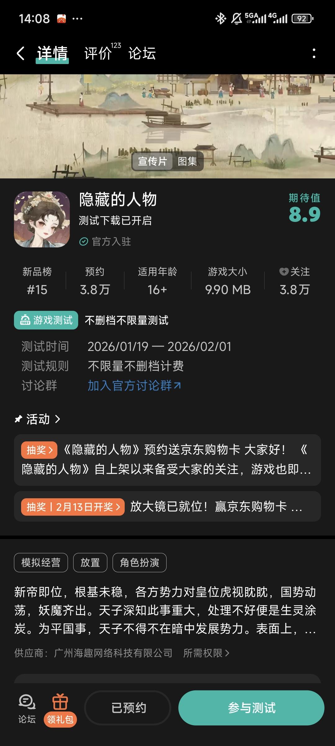 大家好!《隐藏的人》将于 2026 年1月19日10:00开启不删档测试服,感谢大家对我们游戏的关注和支持。现在,大门已缓缓开启。请带上你的好奇心和放大镜,在我们精心策划的活动中,去邂逅那些意想不到的角色,聆听他们无声的诉说。你,准备好开始这场寻宝之旅了吗?活动一、进群福利进群礼包:元宝*100、侍从进阶石*10加入,联系客服QQ:2757945810领取礼包码。活动二、预约/下载赢京东购