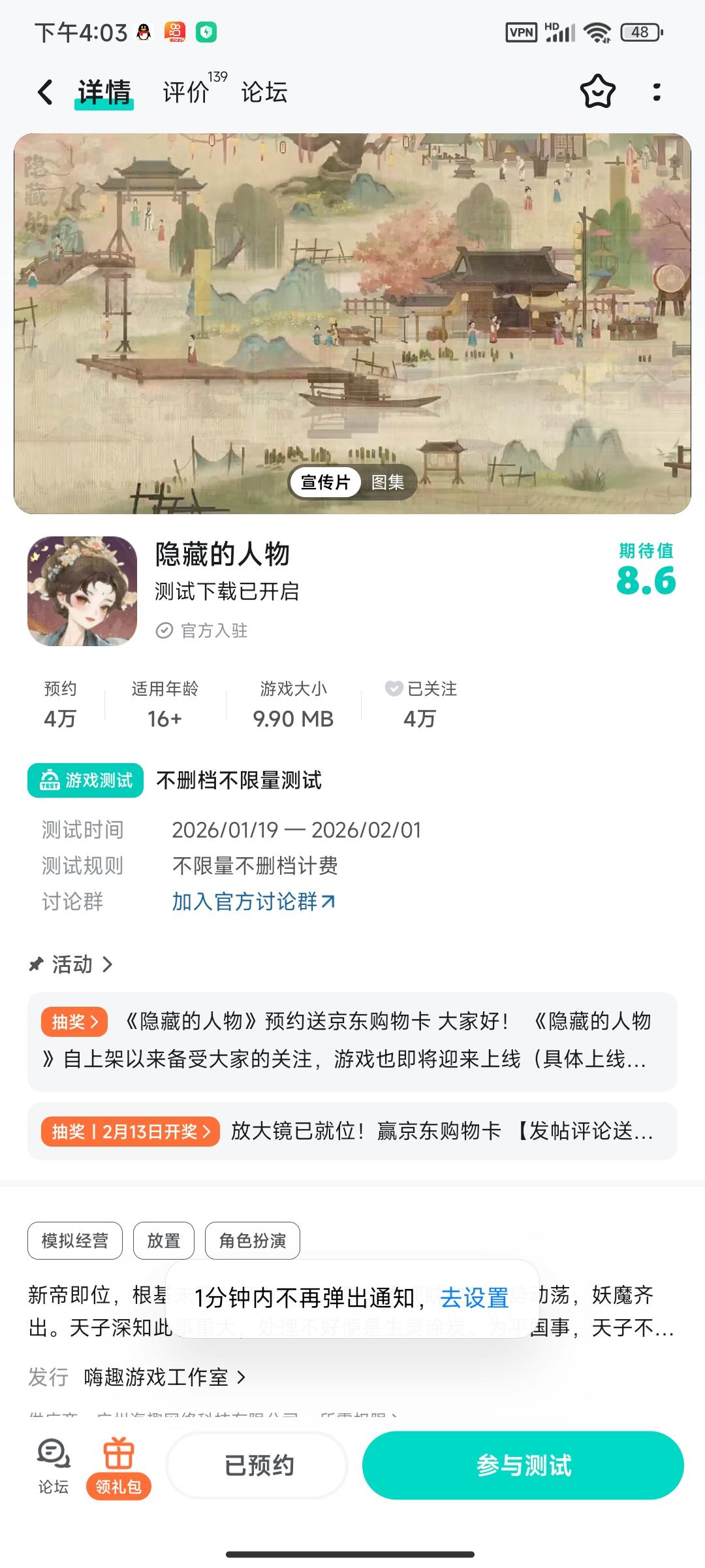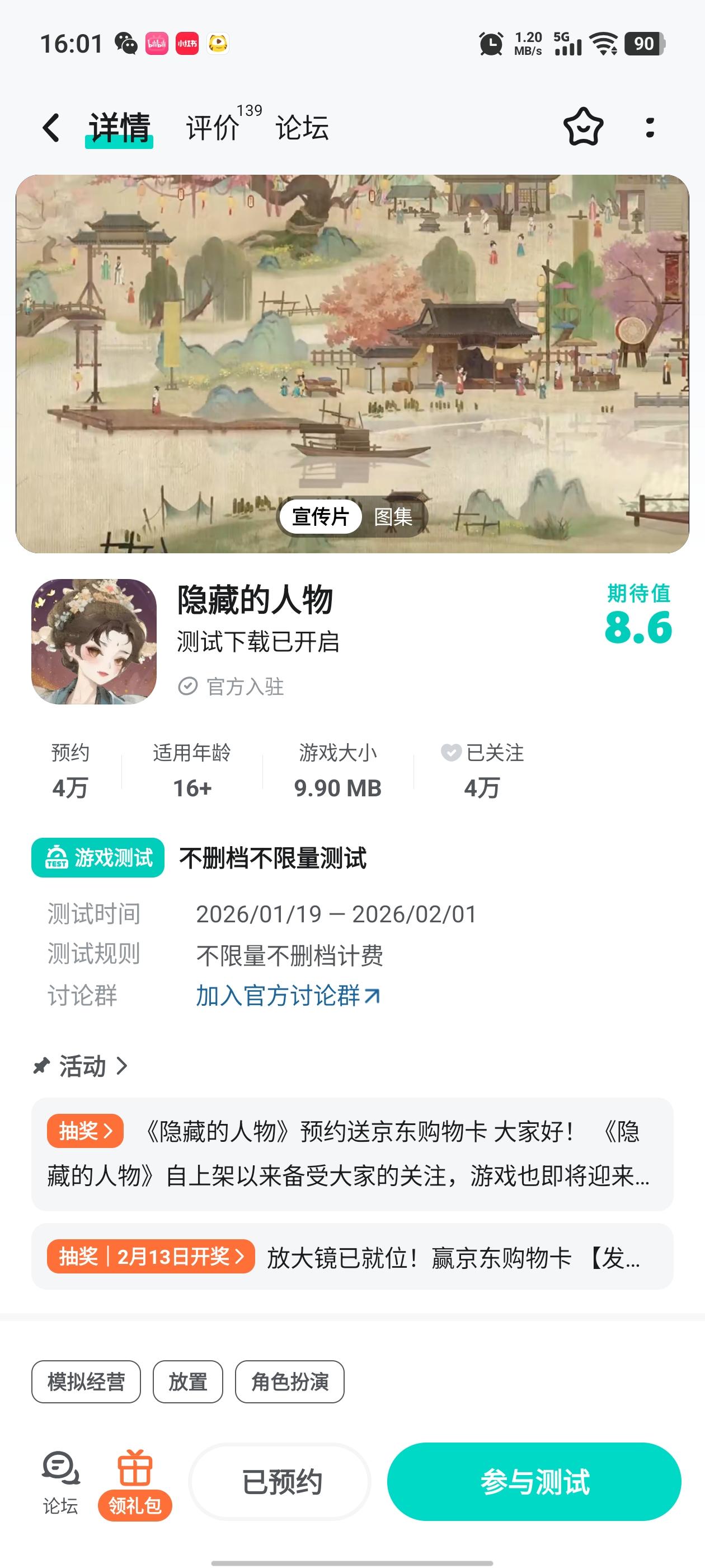 大家好!《隐藏的人》将于 2026 年1月19日10:00开启不删档测试服,感谢大家对我们游戏的关注和支持。现在,大门已缓缓开启。请带上你的好奇心和放大镜,在我们精心策划的活动中,去邂逅那些意想不到的角色,聆听他们无声的诉说。你,准备好开始这场寻宝之旅了吗?活动一、进群福利进群礼包:元宝*100、侍从进阶石*10加入,联系客服QQ:2757945810领取礼包码。活动二、预约/下载赢京东购