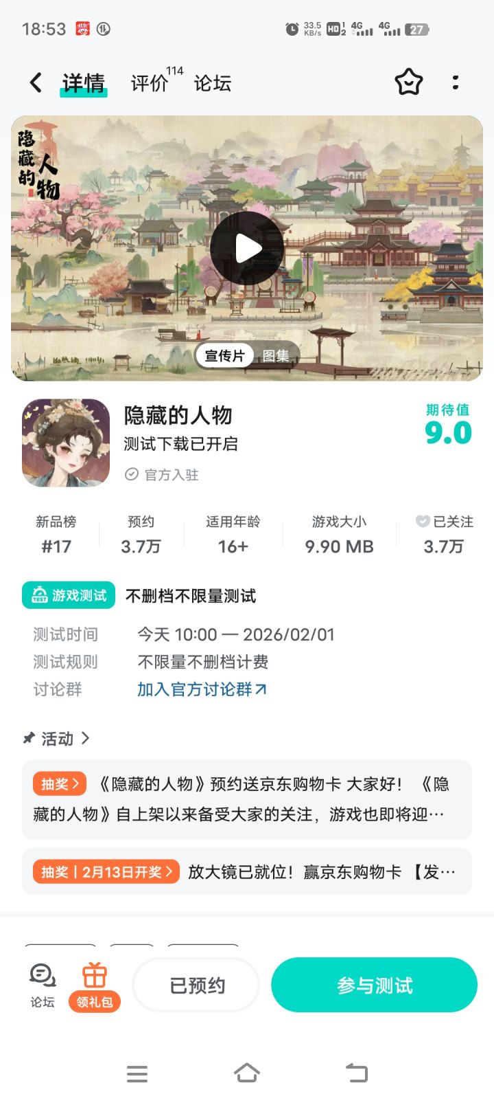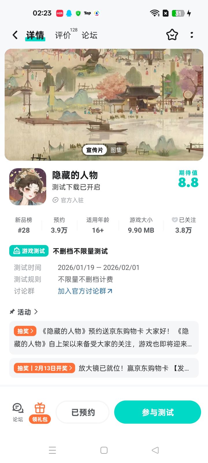 大家好!《隐藏的人》将于 2026 年1月19日10:00开启不删档测试服,感谢大家对我们游戏的关注和支持。现在,大门已缓缓开启。请带上你的好奇心和放大镜,在我们精心策划的活动中,去邂逅那些意想不到的角色,聆听他们无声的诉说。你,准备好开始这场寻宝之旅了吗?活动一、进群福利进群礼包:元宝*100、侍从进阶石*10加入,联系客服QQ:2757945810领取礼包码。活动二、预约/下载赢京东购