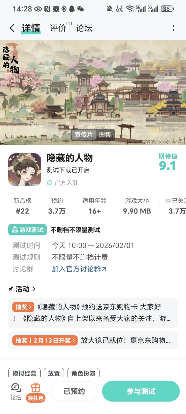 大家好!《隐藏的人》将于 2026 年1月19日10:00开启不删档测试服,感谢大家对我们游戏的关注和支持。现在,大门已缓缓开启。请带上你的好奇心和放大镜,在我们精心策划的活动中,去邂逅那些意想不到的角色,聆听他们无声的诉说。你,准备好开始这场寻宝之旅了吗?活动一、进群福利进群礼包:元宝*100、侍从进阶石*10加入,联系客服QQ:2757945810领取礼包码。活动二、预约/下载赢京东购