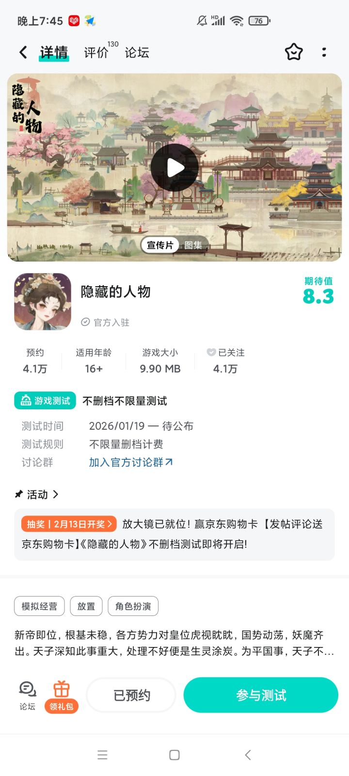 大家好!《隐藏的人》将于 2026 年1月19日10:00开启不删档测试服,感谢大家对我们游戏的关注和支持。现在,大门已缓缓开启。请带上你的好奇心和放大镜,在我们精心策划的活动中,去邂逅那些意想不到的角色,聆听他们无声的诉说。你,准备好开始这场寻宝之旅了吗?活动一、进群福利进群礼包:元宝*100、侍从进阶石*10加入,联系客服QQ:2757945810领取礼包码。活动二、预约/下载赢京东购