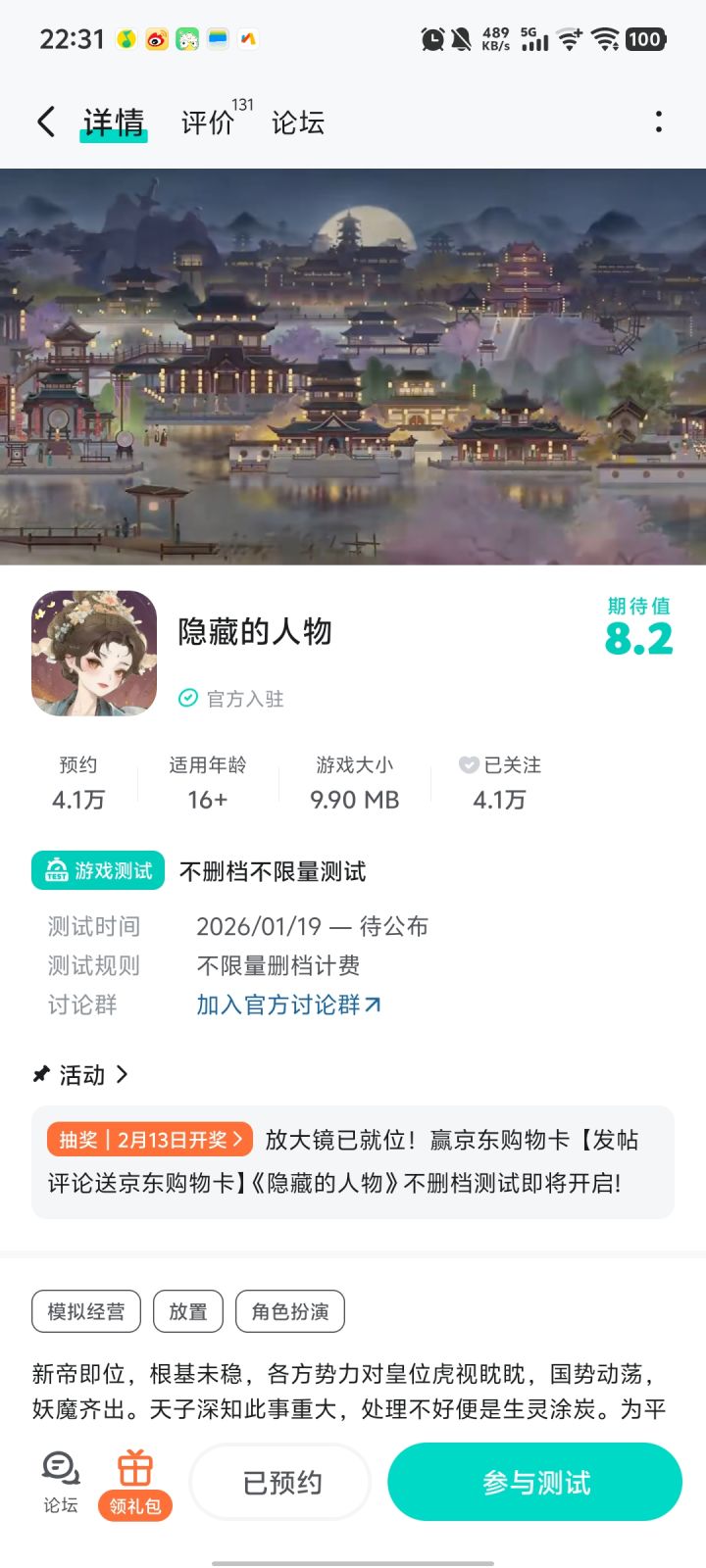 大家好!《隐藏的人》将于 2026 年1月19日10:00开启不删档测试服,感谢大家对我们游戏的关注和支持。现在,大门已缓缓开启。请带上你的好奇心和放大镜,在我们精心策划的活动中,去邂逅那些意想不到的角色,聆听他们无声的诉说。你,准备好开始这场寻宝之旅了吗?活动一、进群福利进群礼包:元宝*100、侍从进阶石*10加入,联系客服QQ:2757945810领取礼包码。活动二、预约/下载赢京东购