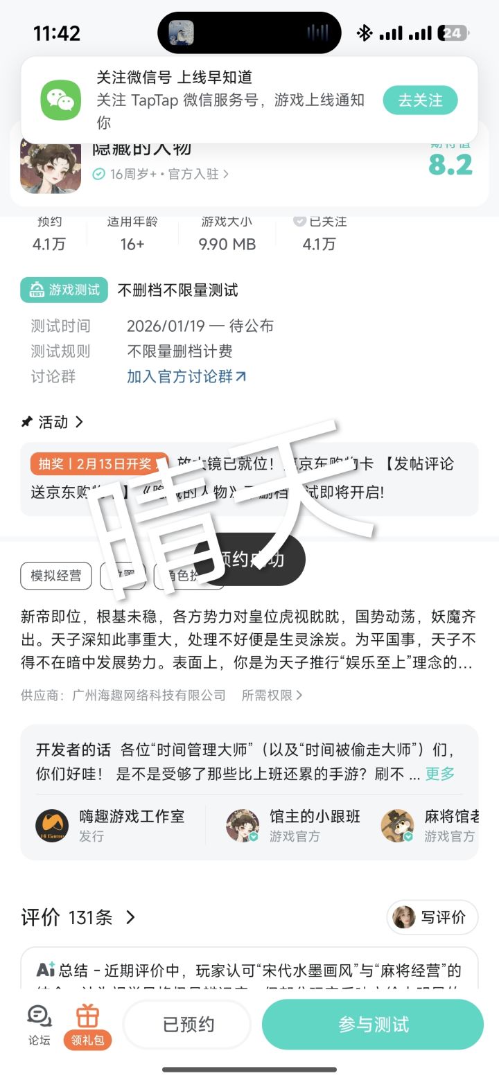 大家好!《隐藏的人》将于 2026 年1月19日10:00开启不删档测试服,感谢大家对我们游戏的关注和支持。现在,大门已缓缓开启。请带上你的好奇心和放大镜,在我们精心策划的活动中,去邂逅那些意想不到的角色,聆听他们无声的诉说。你,准备好开始这场寻宝之旅了吗?活动一、进群福利进群礼包:元宝*100、侍从进阶石*10加入,联系客服QQ:2757945810领取礼包码。活动二、预约/下载赢京东购