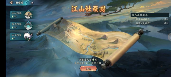 社稷图包括神兵、器灵、仙号三个图鉴,算是收集成就系统,完成收集即可点亮图鉴,增加角色战斗属性。