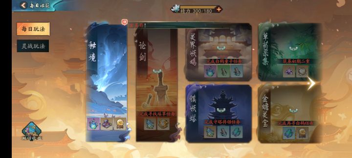 扩展玩法在每日必玩界面,包括秘境、镇妖塔、草药采集等内容,与其他手游玩法很接近,有同质化现象,有些只是换了个符合世界观的叫法。