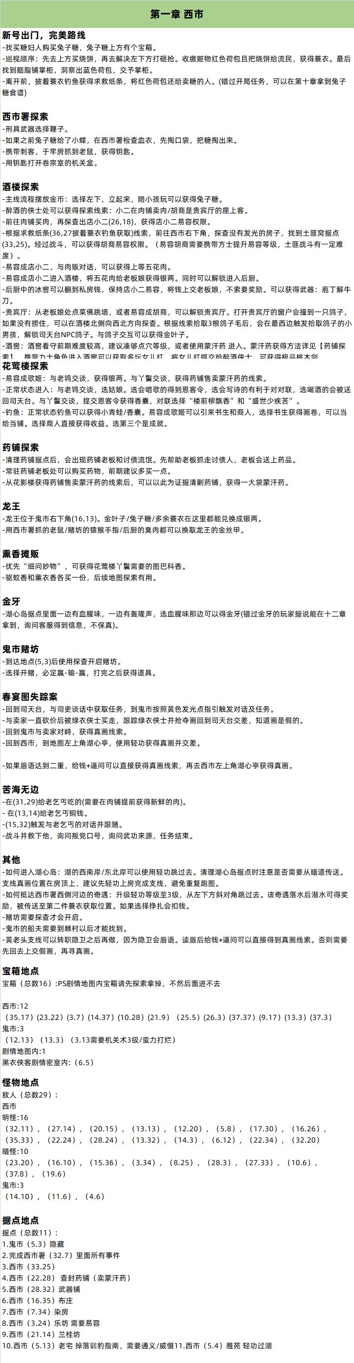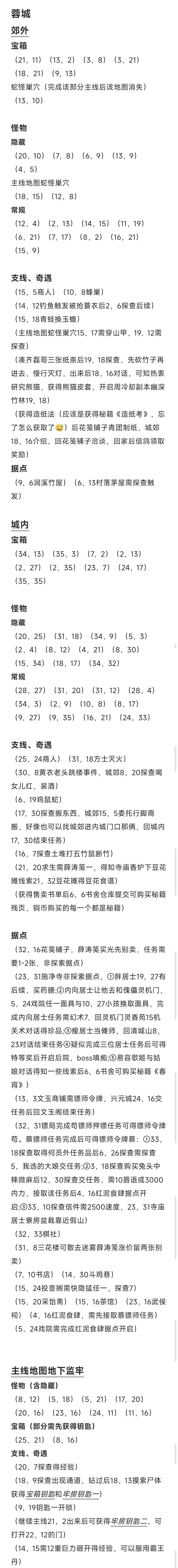 8月7日新增地下监牢部分探索 薛涛笺别卖光了,留两张 第7章蓉城怪物,宝箱,大部分据点和支线奇遇,我看没人发,那我就发一下好了,也懒得整理了,你们将就看一下,如果觉得有帮助,请点个赞[表情_狗头]关于茶馆入场券和没提到的支线,如果我后面遇到了会直接在帖子里补充,应该会…… 补充: ①蛇怪巢穴为一次性主线地图,探索完成后再进行主线。巢穴(18,6)宝箱需探查,感谢补充。 ②进入主城以后可以先去(32