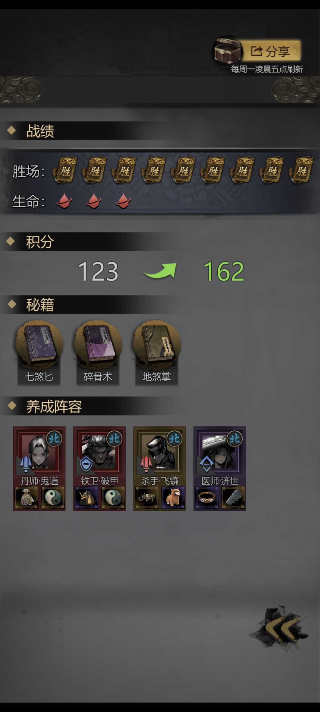 主线BOSS职业推荐及探破需求 前2章就忽略不计了,直接从第三章开始。推荐职业一般是最优选择,不一定是唯一选择,也可以根据boss的技能特点和属性,结合自己培养的角色自行搭配,比如推荐配对后面2345等等就是其他玩家用非推荐搭配过图的阵容。 发个邀请码 zthHmb 新手玩家点击好友→江湖知己→结交知己,感谢支持! ★第三章:棘村 日达木【人形-格挡1】 医师+铁卫+斗械+阴阳 饲蛊祭祀【人