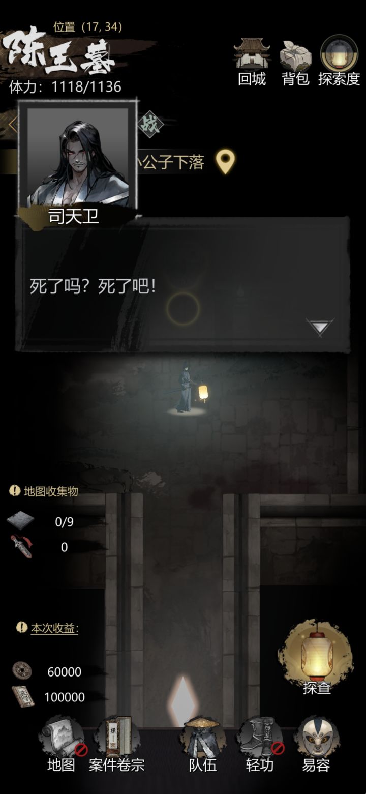 终于干掉水怪之母,因为饮血和飞廉同级,技能伤害故意设置不超过150之间,铁鸳鸯是关键珍品,可能提升一下饮血会容易点过吧!陈王墓里面,有盗墓者,蛇,水怪,水鬼,所以这样人物搭配比较全面探索