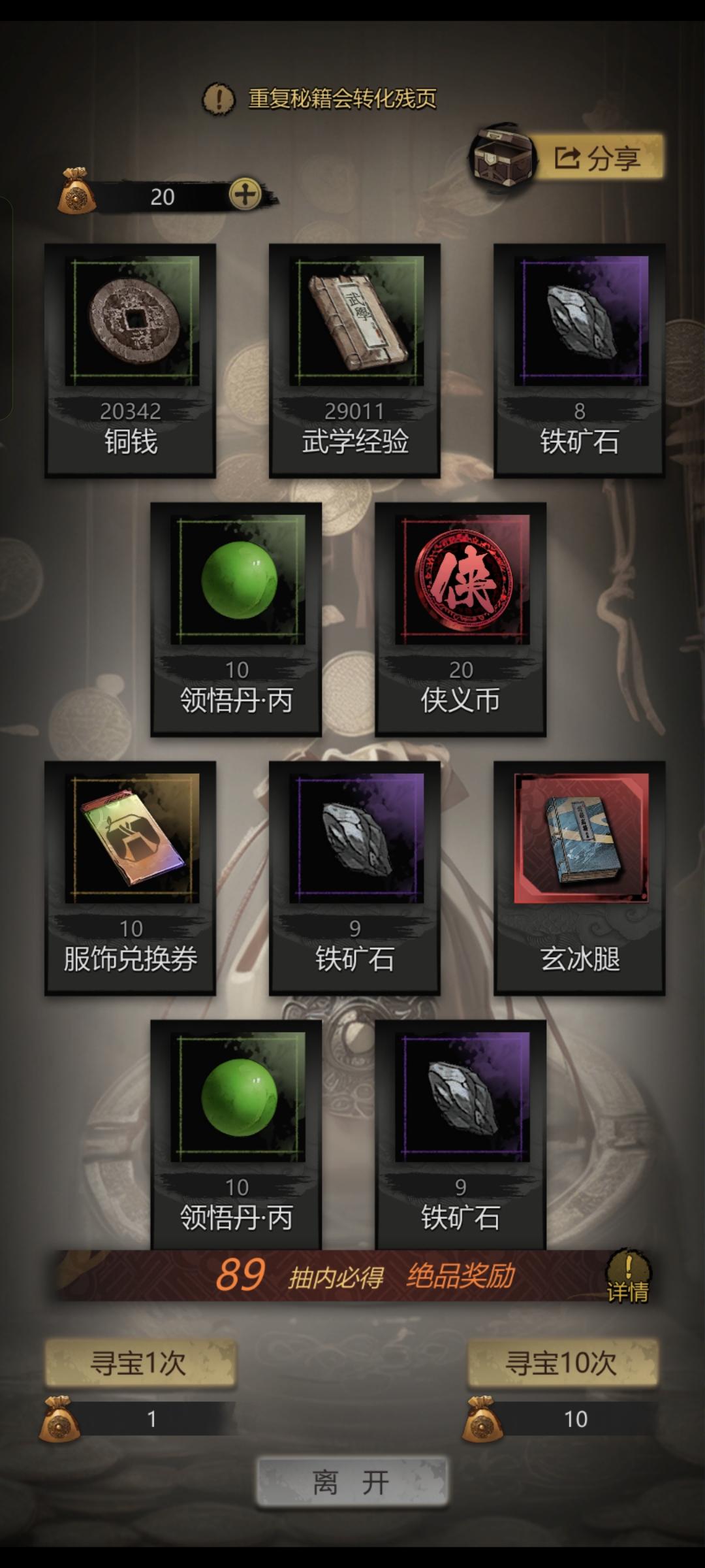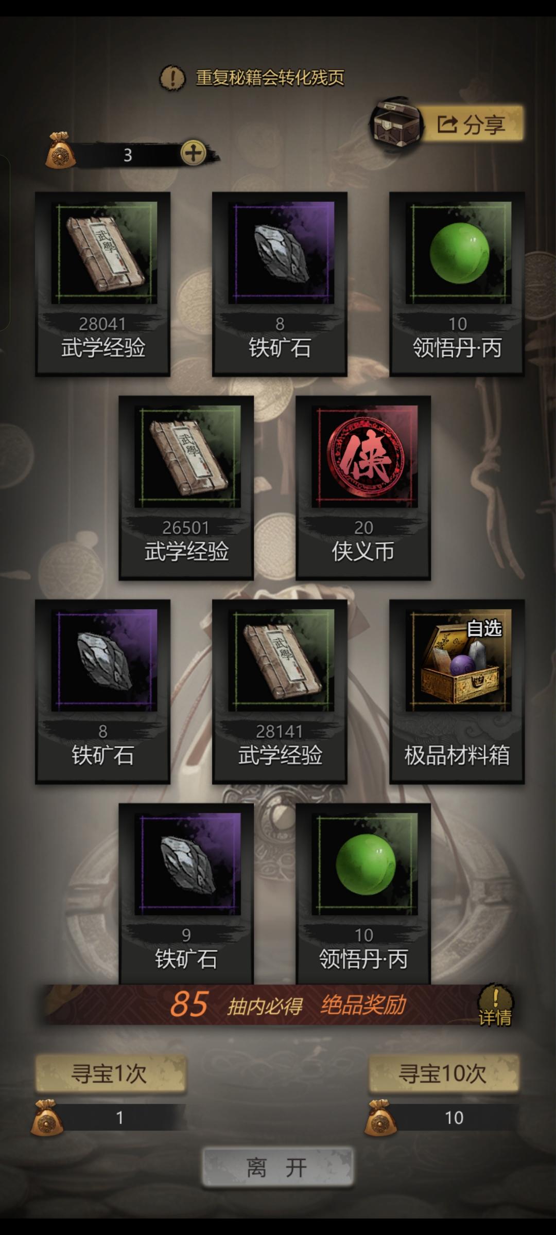 100个百宝袋开的,上次是10个百宝袋开了60个侠义币