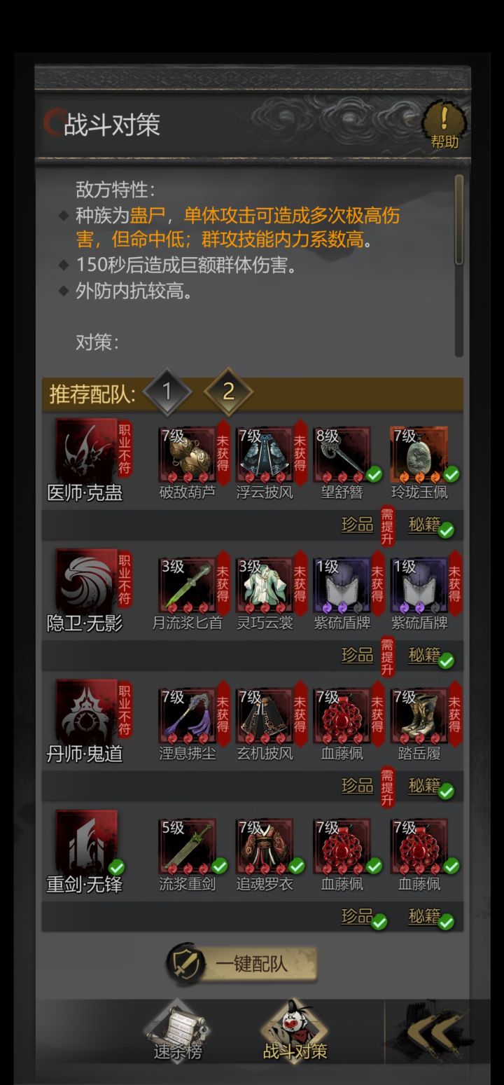 12章用时1月12天,相对于11章来说快了,主要是最后2个boss逃课了(13章算第1个也能逃),这时间主要是卡铁的时间。 第12章的重锤傀儡(通译24)和第13章第一个boss红眼山羊(通译25),都可以不用探破过,重锤要等武器,山羊是可以逃课的主。我到现在通译24都还差42点才够。 额外说一下,不氪穷楼司天令的情况下,打真堂主玄刺伤害不升2品有点难,伤害不够,后面把济世换成入世,入世奶能增加渗