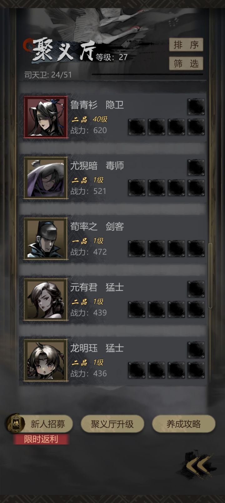 删档测试的时间玩了一次,当时是打到了第七个图,也就是清河县,当时卡到了县令那里,所以前面的玩法都还是比较熟悉,游戏怎么说呢,国风探秘,我是挺喜欢的,但确实有点氪,尤其是卡资源这一块,不氪可能一两天你都只能上线收菜,希望官方后面能多一些养成资源获取的方式,今天主要讲一下养成以及资源分配的攻略,有需要的可以看看,觉得还可以点个赞我目前是打到了第五张图灵机门,卡在了程陆,需要五品才能过,目前缺木头,升