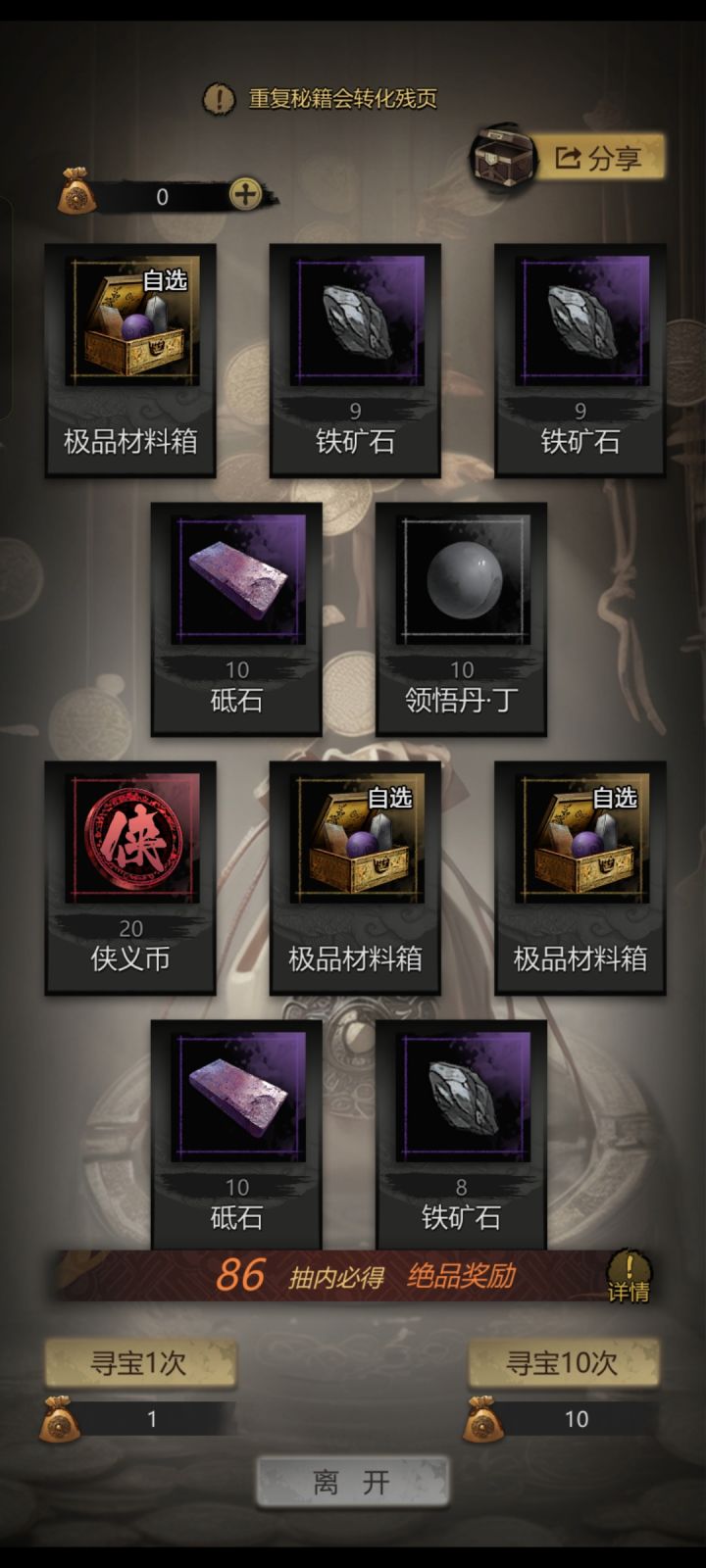 100个百宝袋开的,上次是10个百宝袋开了60个侠义币