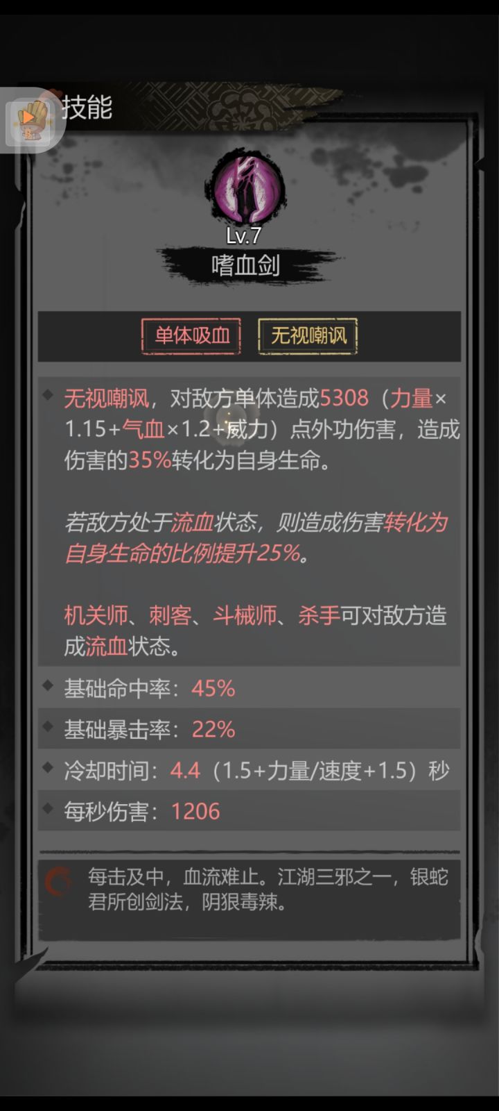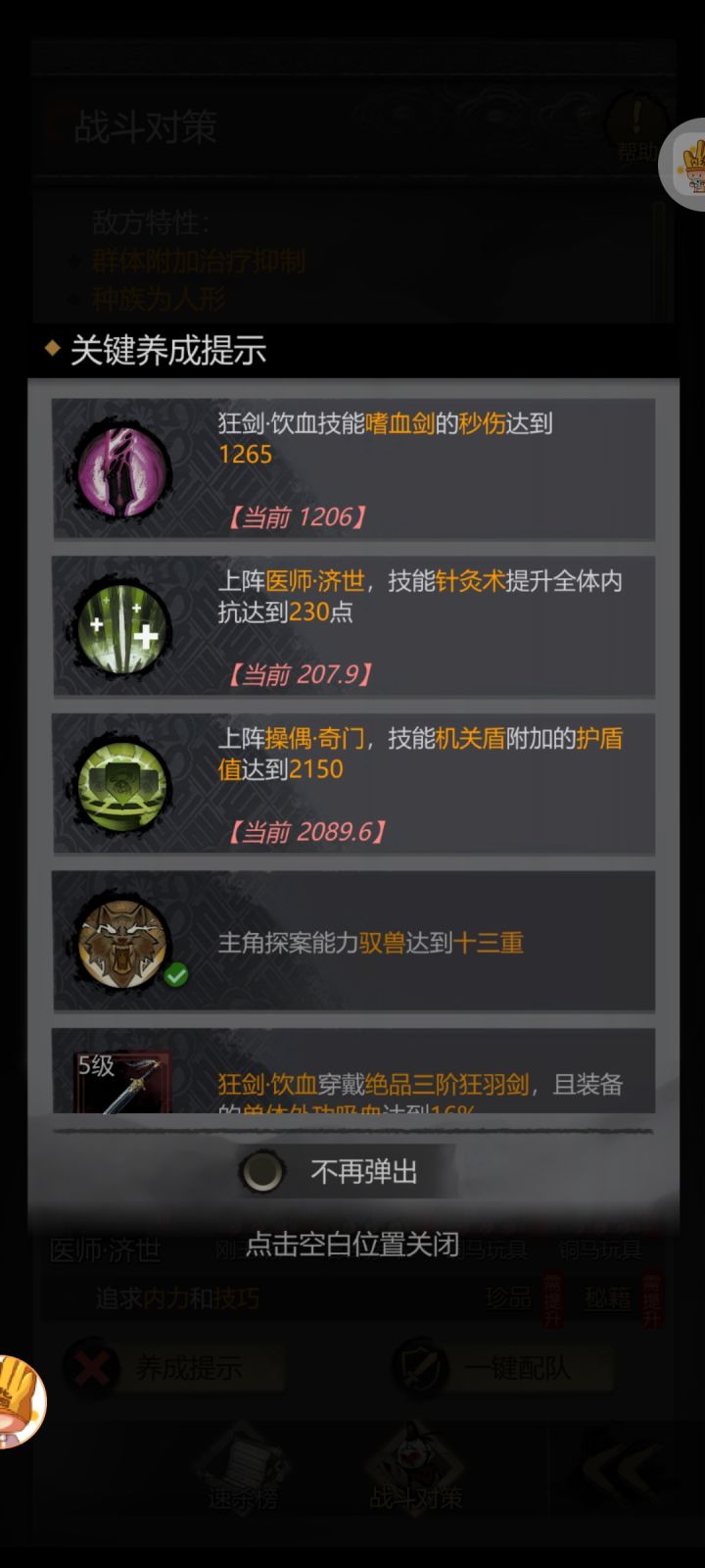 打这个boss别全用推荐装备。分析了一下,这个boss的输出压力其实大部分都在训弓身上,饮血剑客只需要多堆气血,换内抗高的衣服,气血高的饰品和珍品,尽力活下来就行,活下来能多输出两下,也减小队友生存压力。推荐用的衣服是毛绒金丝甲,这个加内抗高。我是济世太垃圾,加的内抗少了,所以训弓也换这个衣服,先保证生存,才有输出。剩下的就是凹暴击了,我感觉没凹几次,40分钟左右就过去了。最后狂暴了,可以