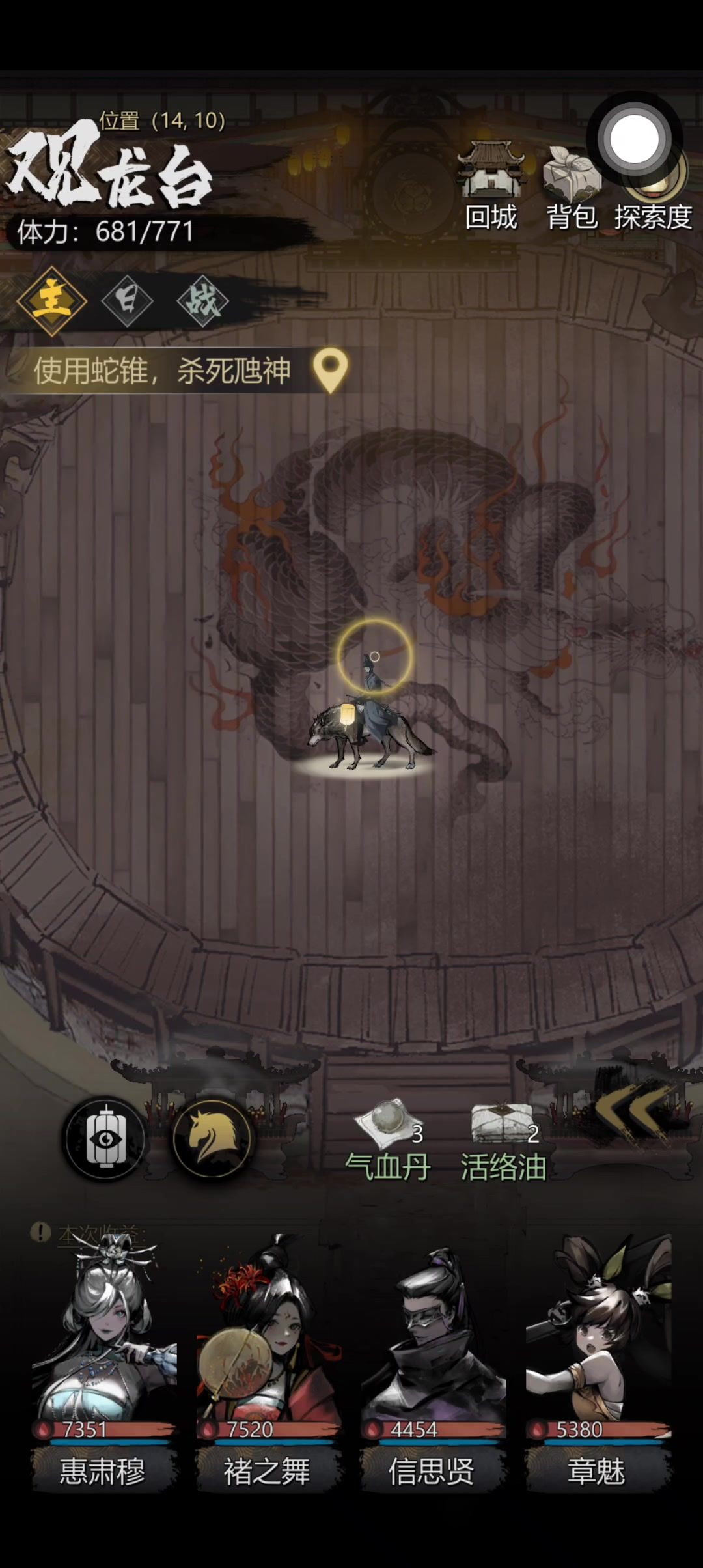 首先济世一定要带银针先发,增加全体内抗。抗住虺神第一波。原本重剑减技离推荐差50准备6品再打,今天调整了一下装备发现能抗住(强敌谱推荐是不是有问题)。于是把渗血装备一键进阶直接上了。 隐卫的话凑闪避到56以上就行,不用多说。 渗血的练度是最重要的,尽可能的提高技巧和流血伤害,技巧最高的装备全给她。每次流血伤害至少要在480以上。伤害不够可以手操隐卫(保证闪避buff存在下)和济世补输出。角色属性可