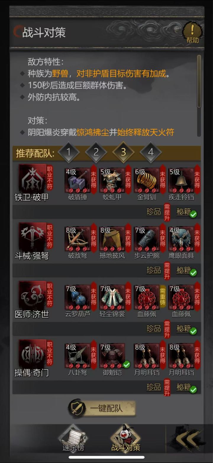 12章用时1月12天,相对于11章来说快了,主要是最后2个boss逃课了(13章算第1个也能逃),这时间主要是卡铁的时间。 第12章的重锤傀儡(通译24)和第13章第一个boss红眼山羊(通译25),都可以不用探破过,重锤要等武器,山羊是可以逃课的主。我到现在通译24都还差42点才够。 额外说一下,不氪穷楼司天令的情况下,打真堂主玄刺伤害不升2品有点难,伤害不够,后面把济世换成入世,入世奶能增加渗