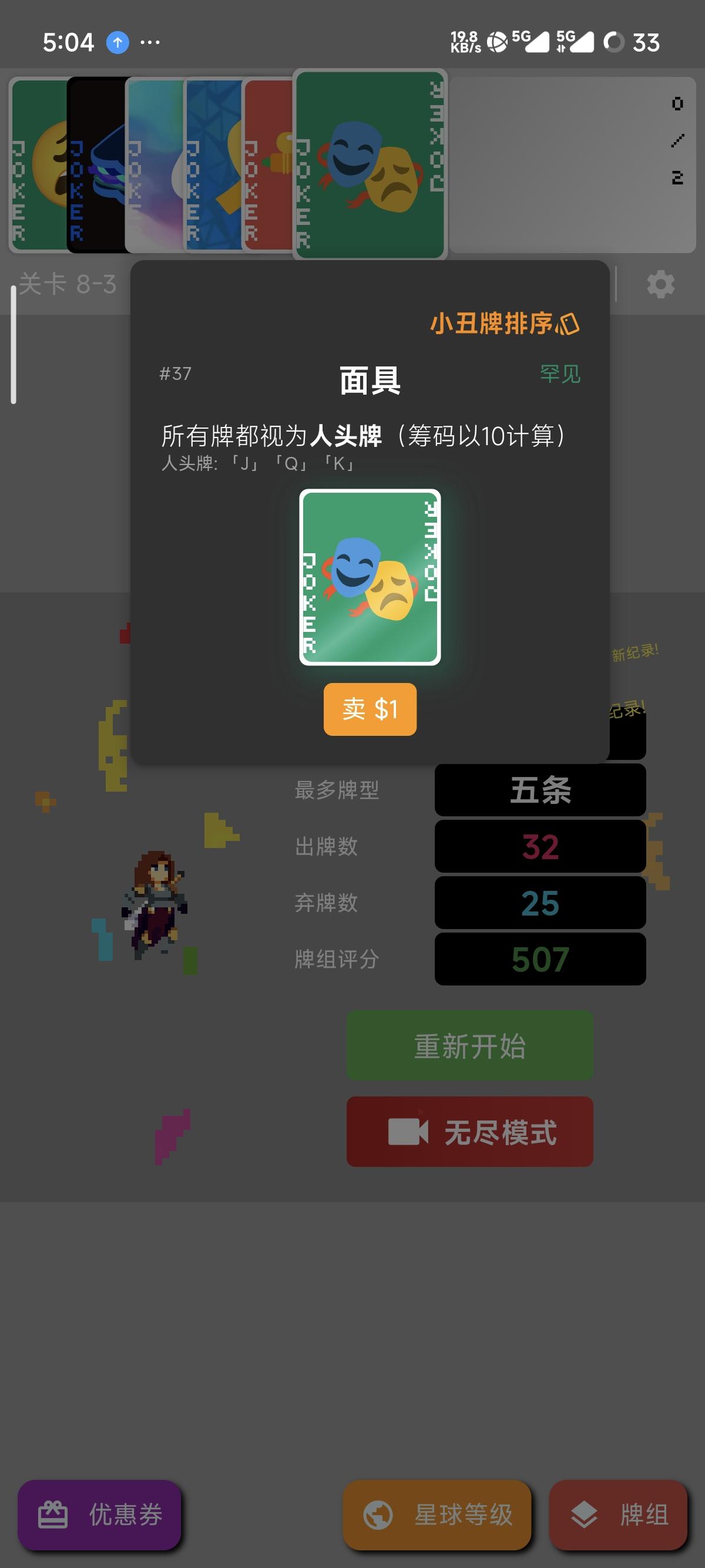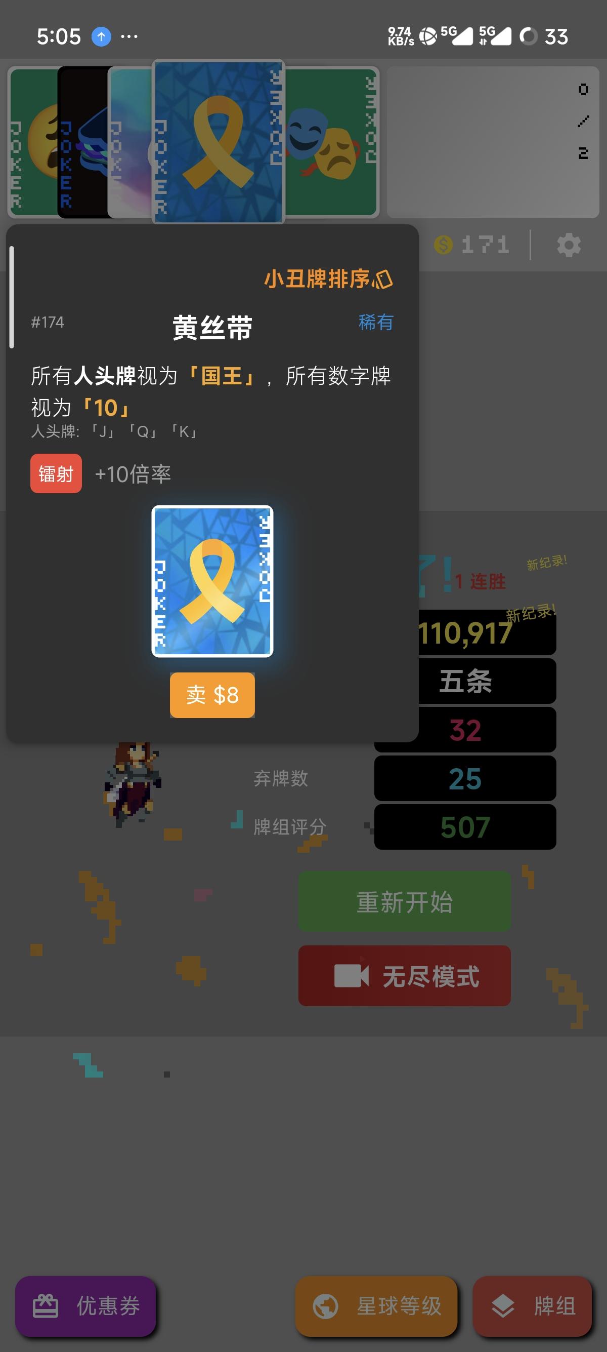 爽到了,黄丝巾+面具,数字牌视为人头牌,人头牌视为国王牌,然后就开启了随便5张牌都是11筹码的五条,再加上水枪和多彩牌的双倍效果,无脑叠倍率,每一泼都是200+倍率