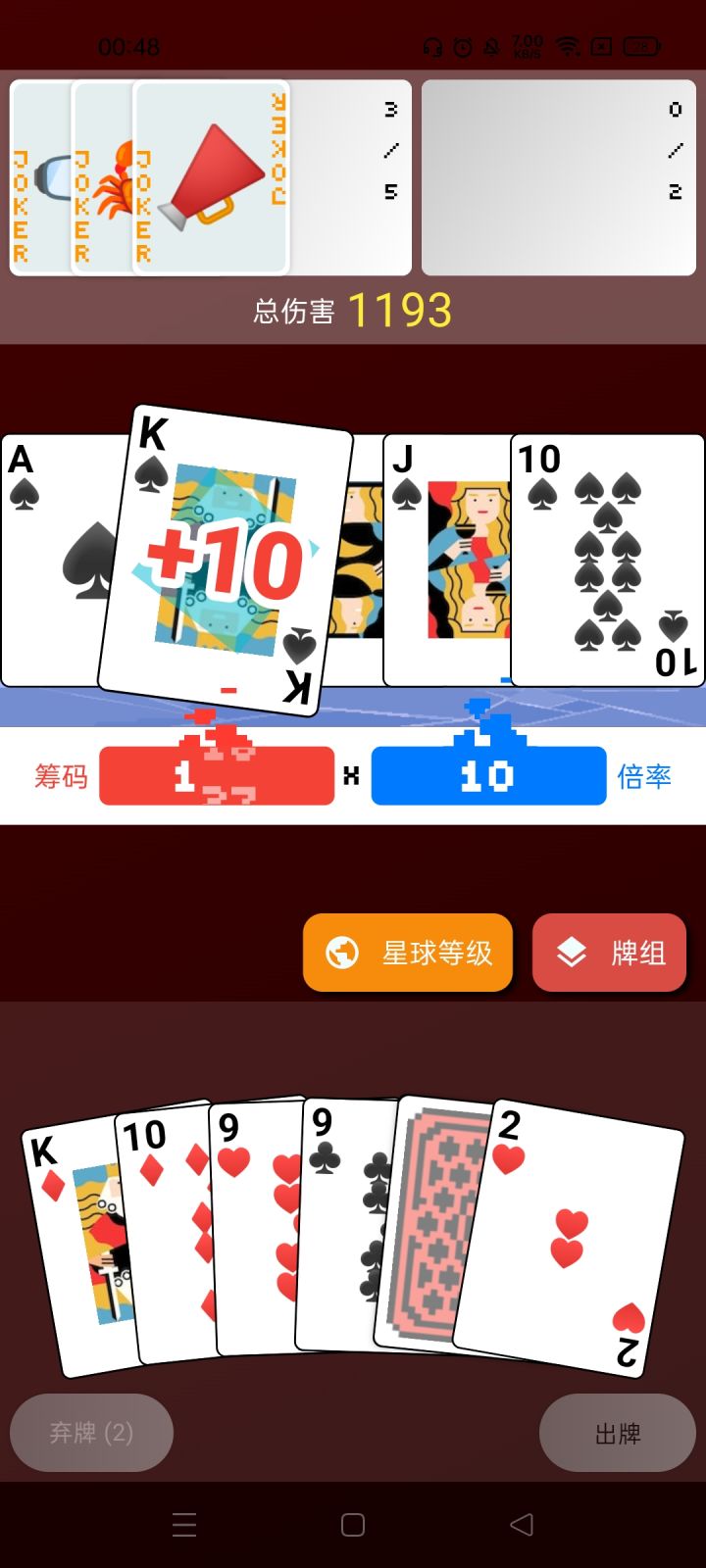 难度低。有许多非常bug的牌,可谓夸张,拿到后稍微操作一下,就能无敌。但是爽就是这么来的,就要这么变态!不变态我憋一整局,浪费几十分钟搁这过家家?我就要日天日地,日穿钢板!有了这些牌,本来毫无希望的一盘,一下就活了。或者本来是稳妥发育,一下就必须要浪起来了。说一个bug牌:皇后已死——每次皇家同花顺后生成一张负片小丑。我为了这个牌用了1.5小时构筑了一套卡组,这套卡组最后只剩5张牌,就是黑桃10JQKA,每张打上全部特效,你们知道我心理活动吗?激动?不,我害怕。我害怕把boss给打死了!我得猥琐一直打皇家同花顺。这把我截图了,下面发。