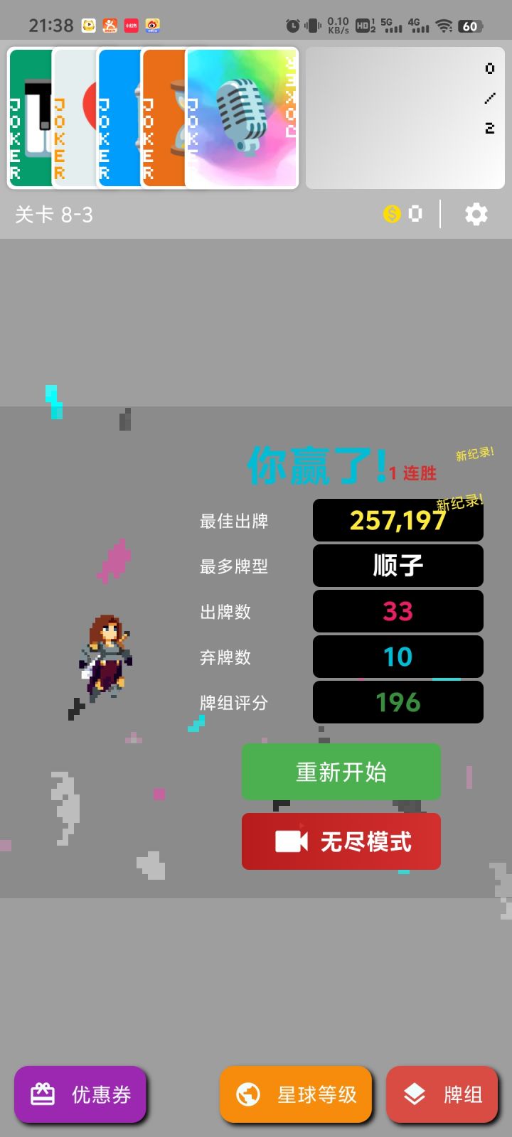另外,建议后期一定要开记分动画倍速,否则会被成百上千次小丑牌记分效果触发搞到不耐烦。我刚开始就是没注意到设置里可以开倍速,出一张头牌要等三五分钟的记分,后期根本没耐心组牌了。