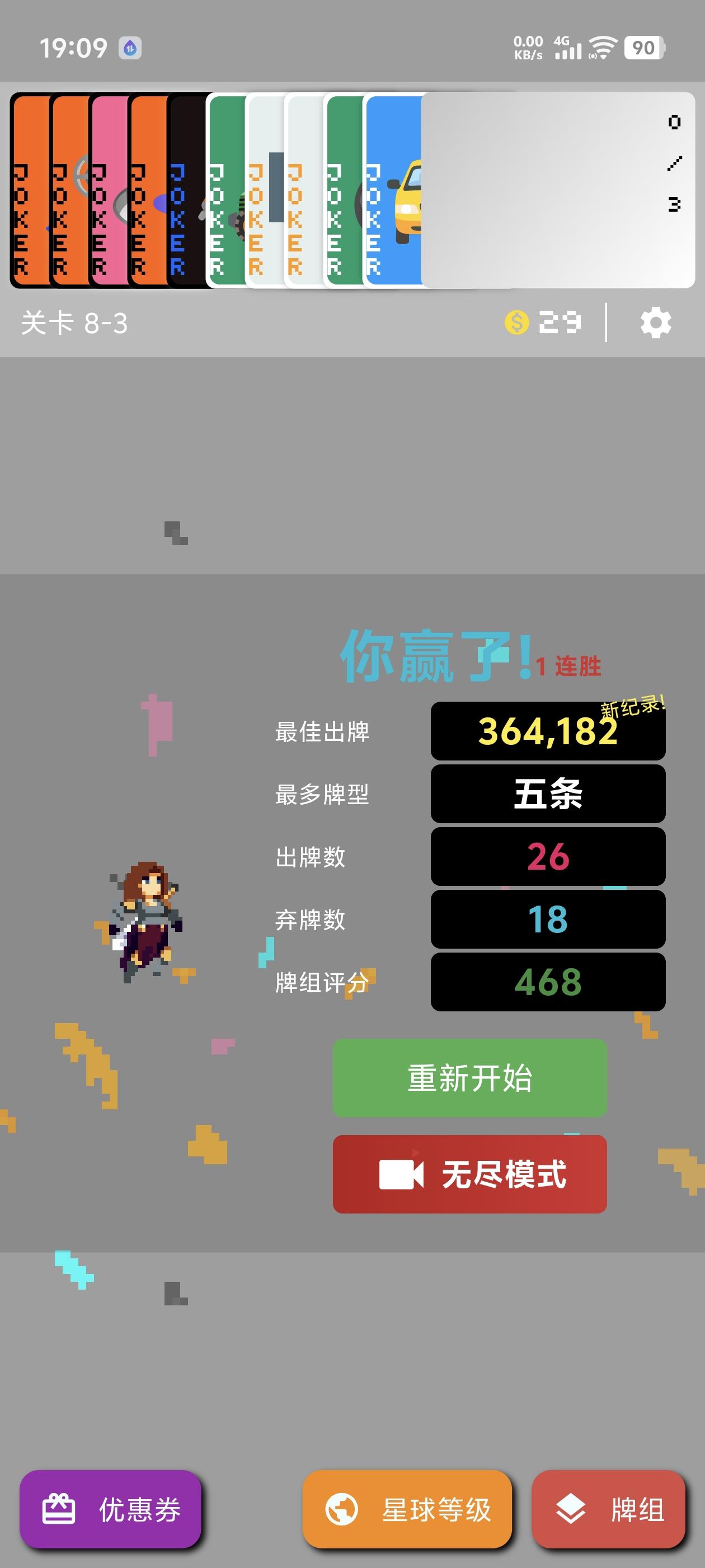 简单的规则,肉鸽的玩法,只玩了1天时间就玩了7.6小时,上瘾程度拉满。因为游戏的伤害计算是:牌型伤害*小丑牌(武器)伤害。所以我们前期靠牌型去顶基础伤害,中期靠直接提升倍率的小丑牌提升伤害,后期无尽模式下的怪物血量指数级提高,我们需要左脚踩右脚的方式去追赶甚至超越数值。这里简单的给几个左脚踩右脚的方法:数值方面:传奇卡皇权(QK倍率翻倍),传奇卡海螺(卡片再次结算),传奇卡水枪(右边一张罕