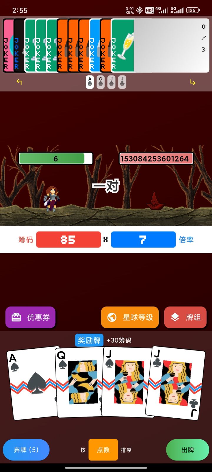 牌全是多彩红印玻璃黑桃Q,星球牌对子320级,刷商店量也见那张小丑,300多次