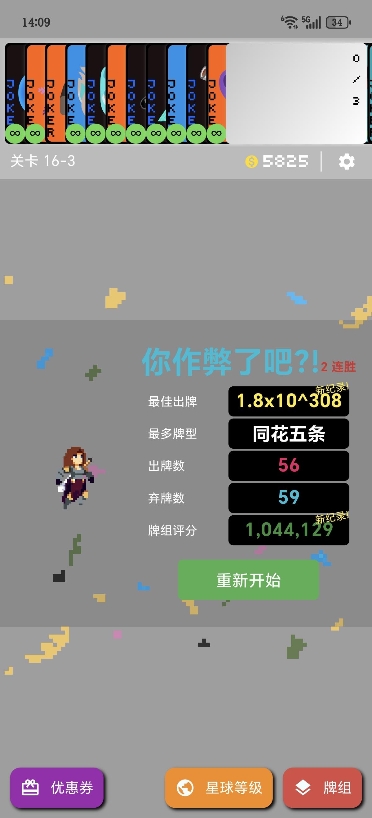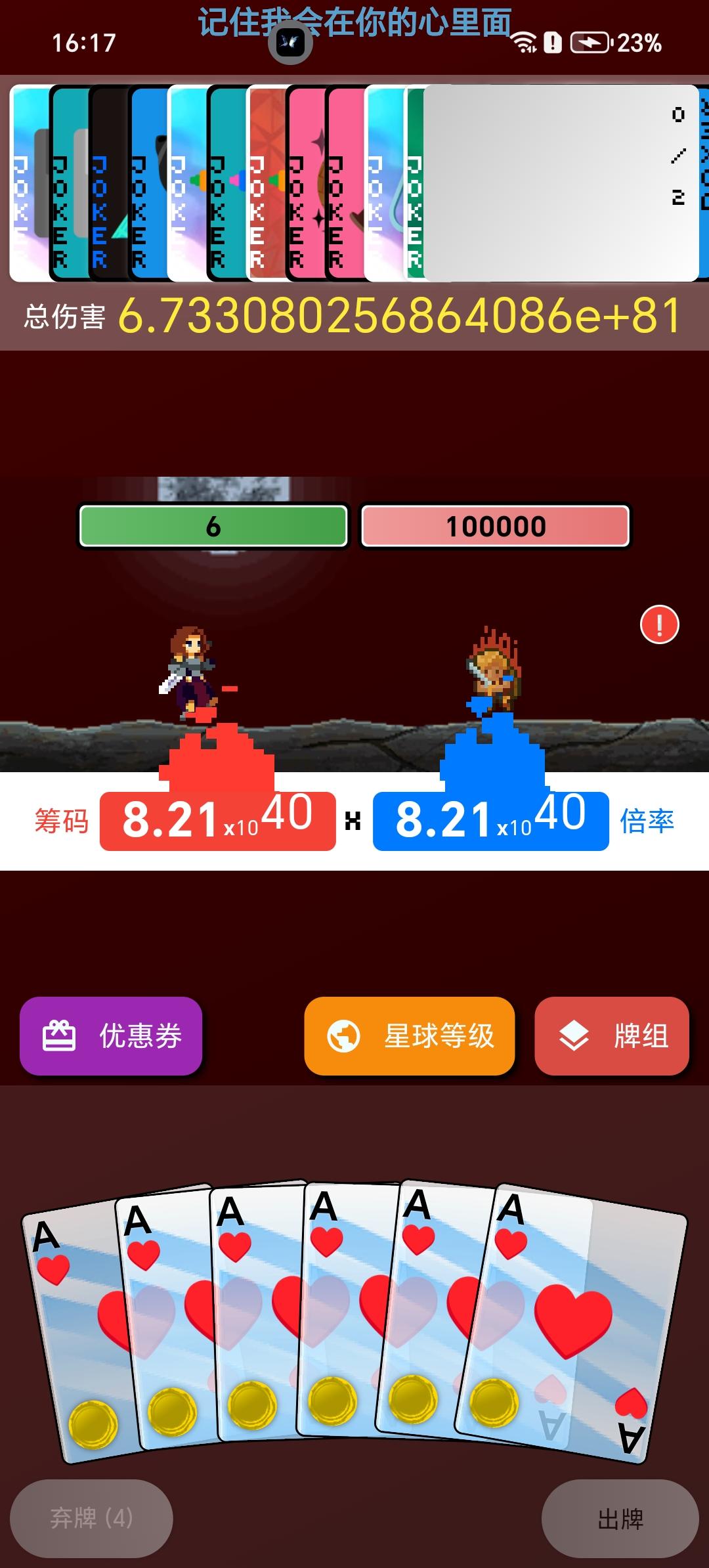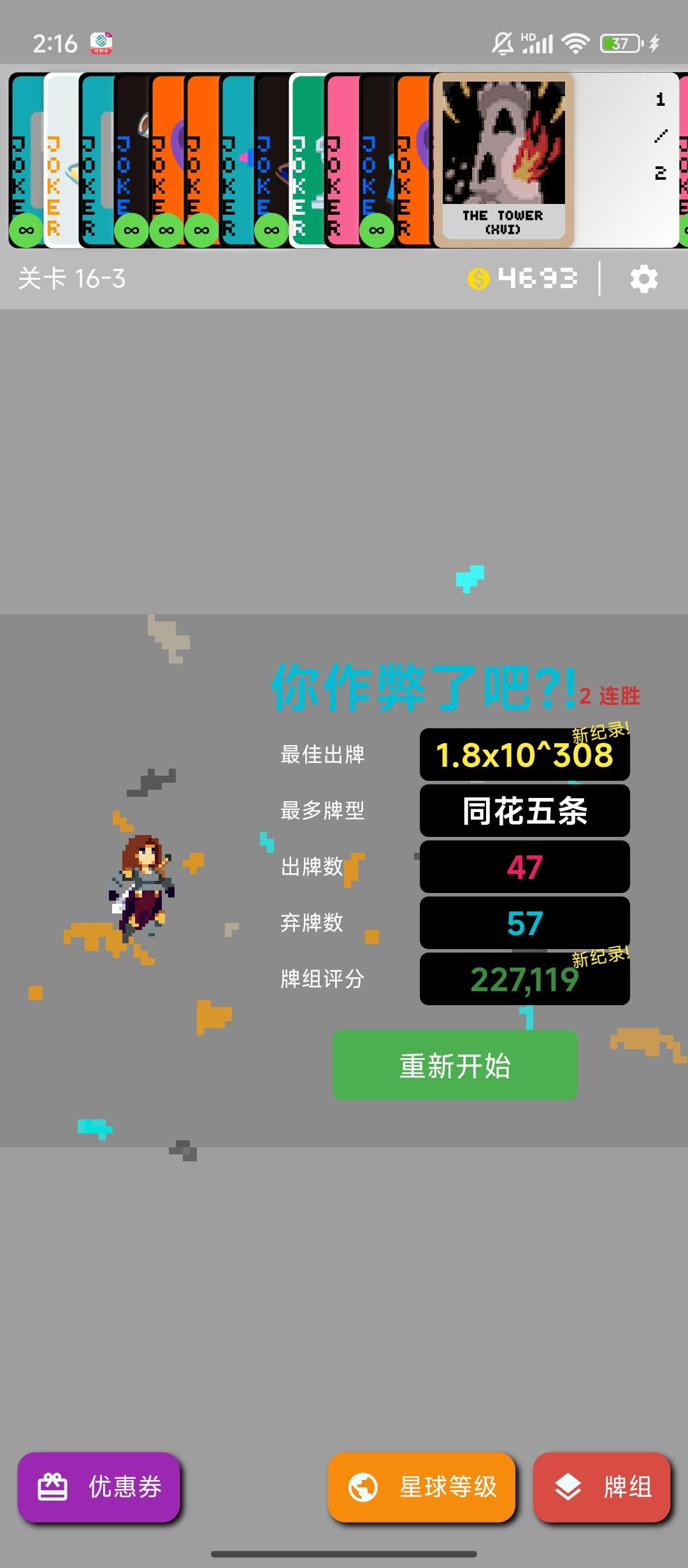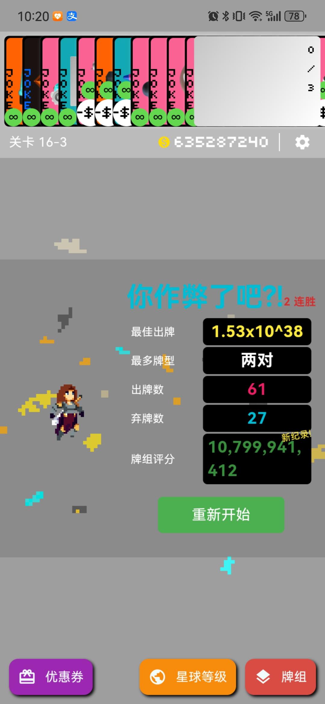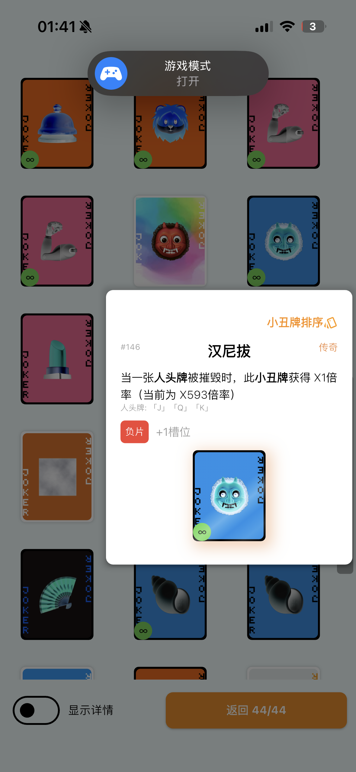 只打了8—3结算了商店买了三个存档,核心出装是水枪,水枪有三个都带底板的其他全是存档给的负片。罕见牌拿了六七张,水枪给一个X3直接被反复刷好几次,给属性刷的很离谱,关键是最后还有个天平 平衡了筹码(不然筹码基础值才四位数),这局单牌过的 (挑战给的玻璃牌加幸运饼干导致玻璃牌必碎)所以我给单牌等级刷到了87级(这波外形人和塔罗大亨立大功)塔罗牌给了几十张节制,在双打折加成下,一个究极塔