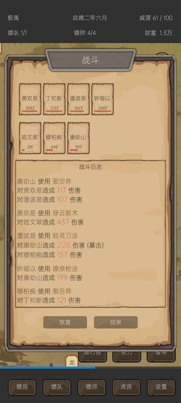 无聊的时候点开了这个游戏,打发时间还挺有意思的,还在摸索阶段很多地方没有整清楚。设置里面还可以修改,让游戏有点挂机那意思了,但是没法开二倍速。遇到土匪或者其他敌人战斗完之后血量都没了,恢复是一点点回满的,也可以用药品直接恢复,不过可以暂停去药铺那些地方制药啥的,可操作性还是挺高的,但是为啥有时候一级难度的钱还比二级难度高啊