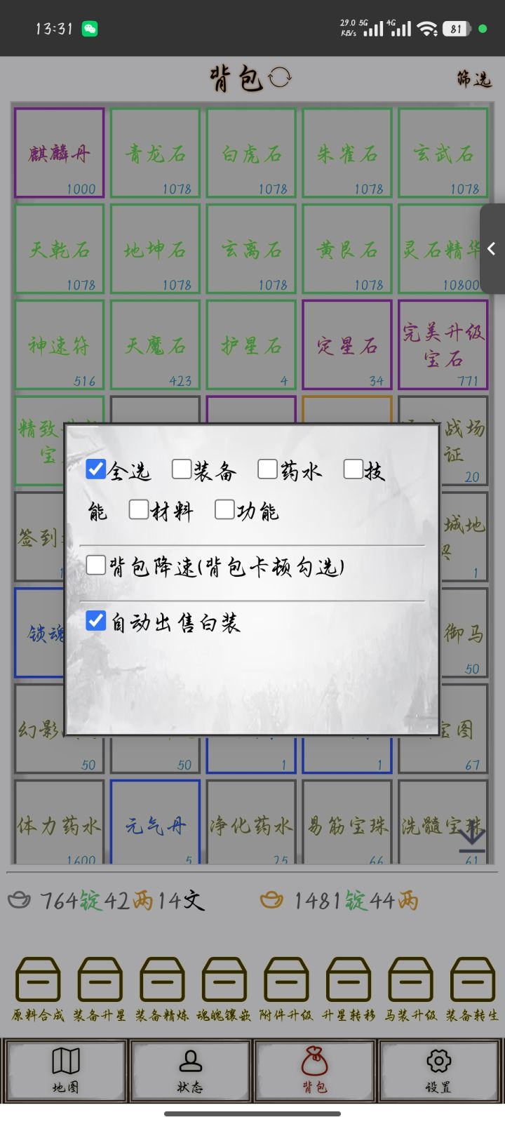 在背包右上角筛选,里面有个自动出售白装,这个功能是自动打开的。前三十级装备可以在王城商店购买,之后的装备就只能地图小怪掉落,不掉装备可以看下这个功能是否打开。