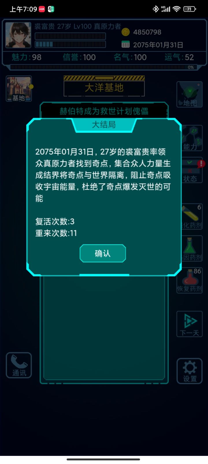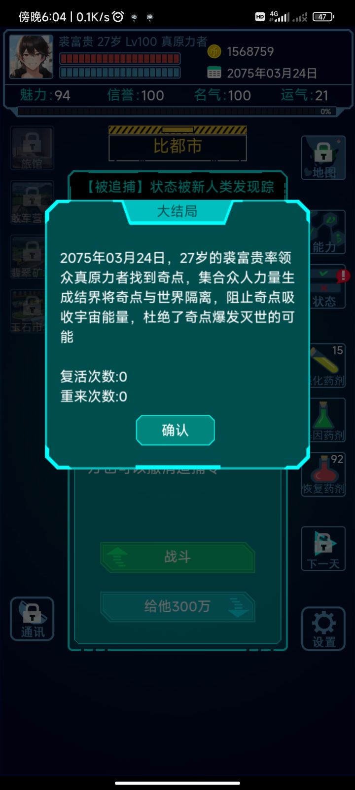 由于制作比较粗糙很多玩家不会玩,特此发条攻略T_T1、点左边场地可以切换NPC2、游戏核心玩法就是赚钱嗑药升级,可以通过贷款、打工、收购产业、消灭敌人来赚钱3、时间越长敌人的等级越高,第一转可以尽量不打架不升级积累金币,然后挂掉选【重来】上一转的金币可以让这一转快速升级4、在广深市的商场找龙献祖对话,从强化人到四型战士他都会送基因药剂5、基因药剂可以去德里市地下黑市卖掉给下一转保留金币【