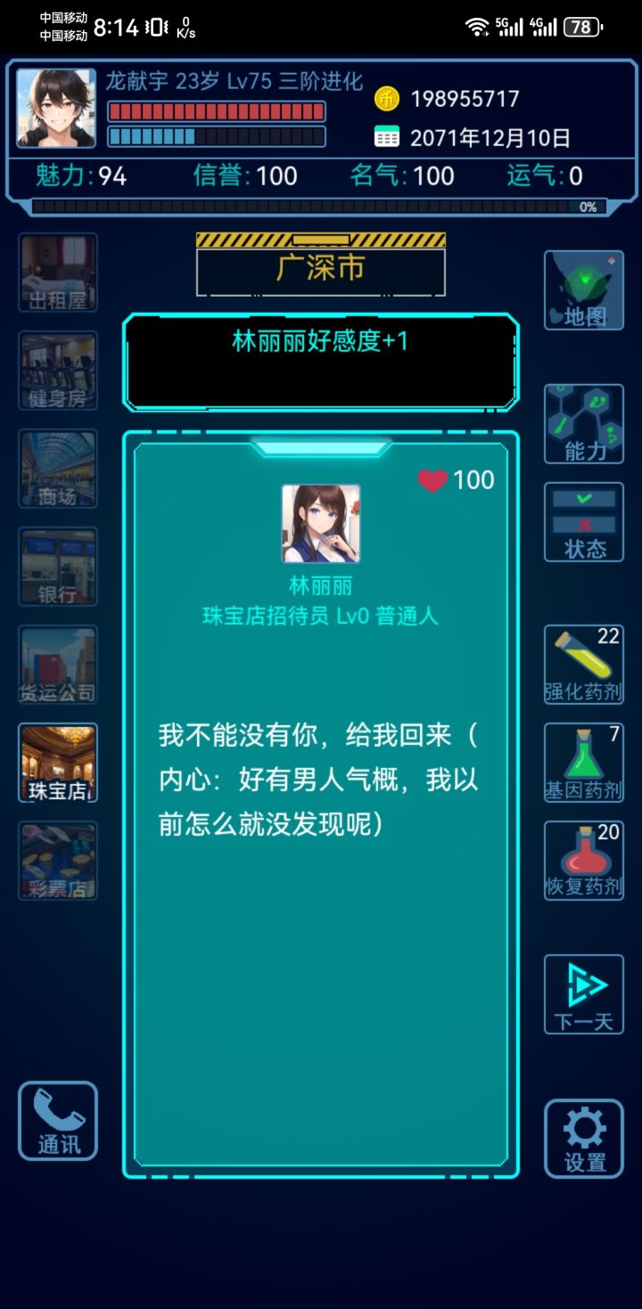 开局拿到开局拿到基因药剂,直接去黑市卖掉,回来先把,彩票的好感度刷满,点管理,疯狂买买买,然后加微信,随后就是要么去攻略那些时间比较长的,要么就是直接,疯狂提实力