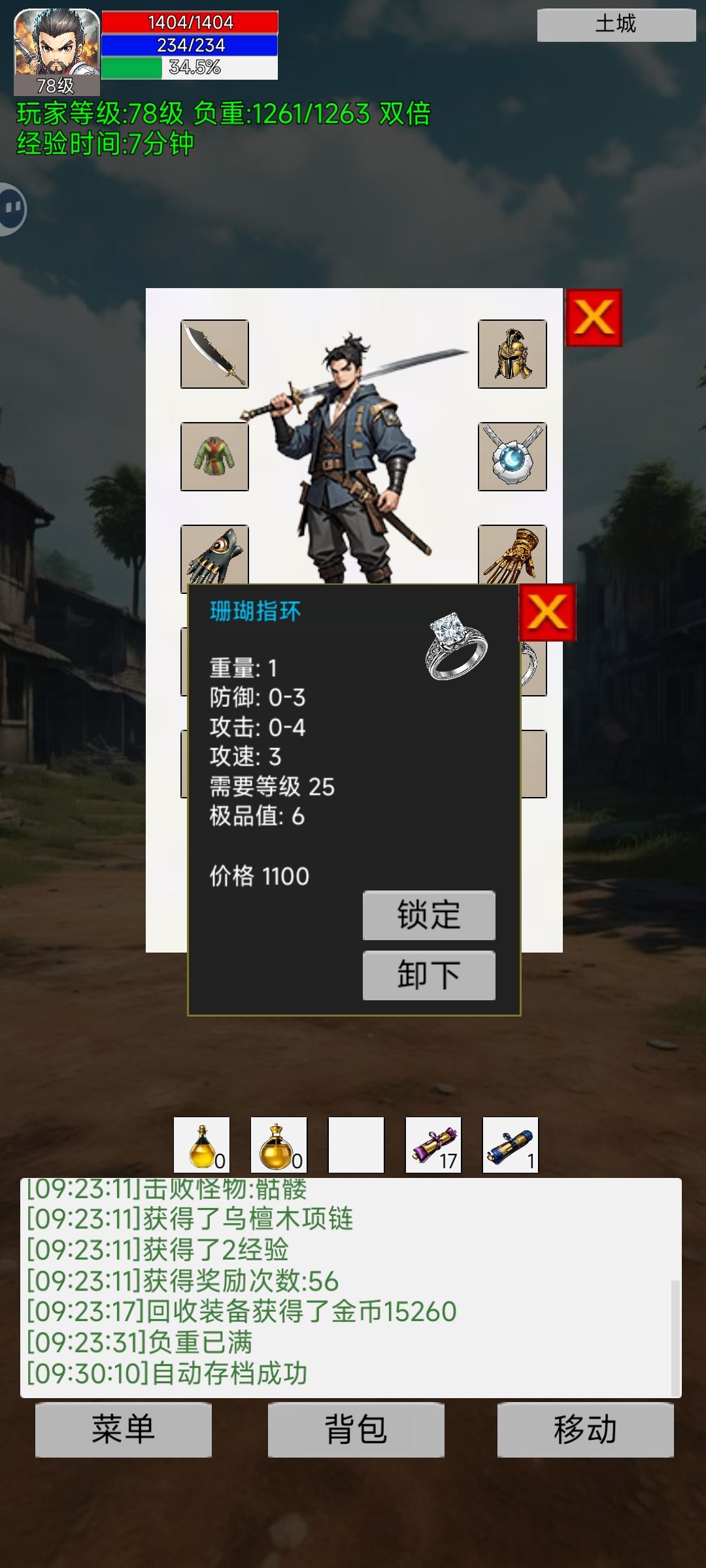 武器:7-22水中月,0-25地狱战斧 项链:1-5幽冥项链 衣服:防御4-7战士盔甲 手套:防御0-3幽冥手套 攻击1-2死神护手 戒指:0-5龙行战戒 1-2降妖戒指 0-4珊瑚指环(可出攻速) 头盔:防御3-3的一个头盔 头盔在仓库不知道怎么消失了,龙神好像不会出头盔,暂时不知道名字了。戒指只见过珊瑚出攻速,龙行极品不歪都没见过。 最后催更新地图,催更幸运系统实装。