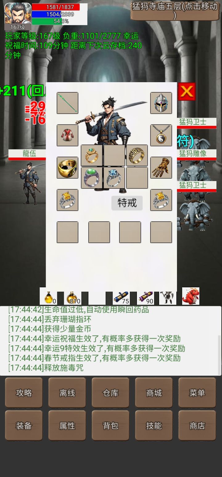 #无限升级的战士传说 #极品特戒 1.开局挂1级地图打鸡,负重够了输入新人兑换码(vip666)里面有2个过度武器。2.看广告,先买7个双倍吃满时间,一直挂1级图打鸡,可以一直到50级,然后去沃玛2层点离线挂机(什么时候去看个人,主要是为了节省后面刷沃玛经验套装的时间),期间设置过滤垃圾装备、红、蓝药水,2个基础技能满了,设置不拾取技能。3.重新登录回到继续刷鸡一直到没经验为止(等级差>65