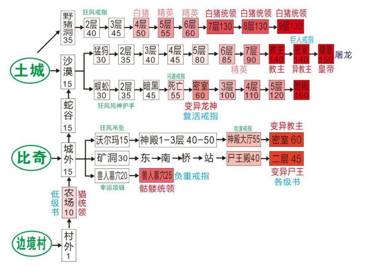 部分稀有装备幸运项链(兽人墓穴,矿洞小怪掉落)狂风之蓝玛瑙吊坠(沃尔玛小怪掉落)狂风之死神护手(蜈蚣洞小怪掉落)狂风之降妖戒指(野猪洞小怪掉落)小巨人戒指(普通骷髅统领)防御戒指(普通尸王掉落),攻速戒指(普通沃尔玛教主掉落),闪避戒指(普通龙神掉落),生命戒指(普通暗黑毒蛇掉落)复活戒指,祈福油(变异尸王,变异沃尔玛教主,变异龙神,变异白野猪统领掉落)巨人戒指(变异猛犸教主