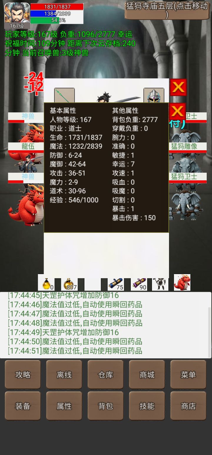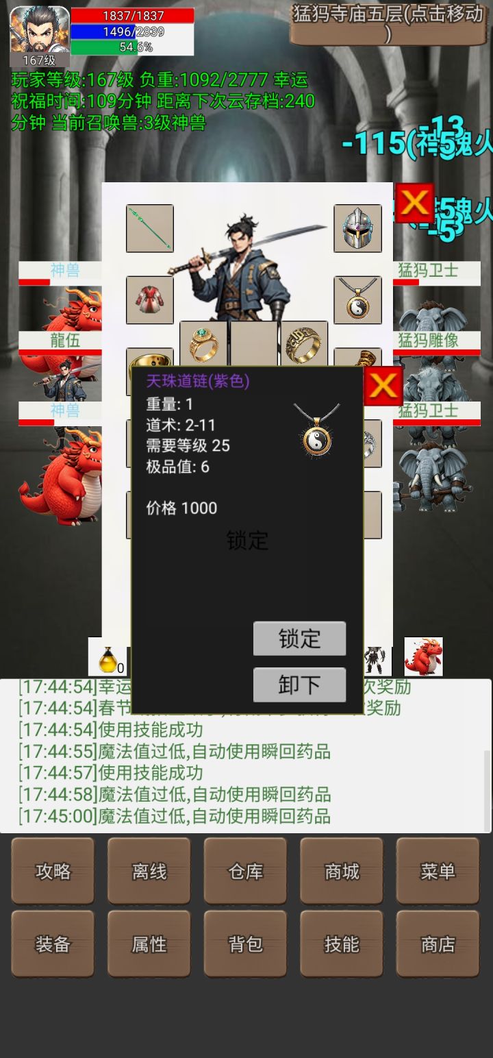 1.怪物属性全面调整,削弱攻击防御2.新增随机卷轴,可免战斗移动地图,3.随机卷轴和回城可叠加994.商店买的药水,卷轴默认锁定5.极品展示颜色改变6.限制1天最多看20次广告,元宝上限120个,金币上限500万金币,双倍经验上限24小时7.购买金币的条件改为4万金币以下可以购买 8.一命模式下改为2月4号前可以读写存档9.被10级以上的怪物攻击至少扣1点血10..装备会根据品质