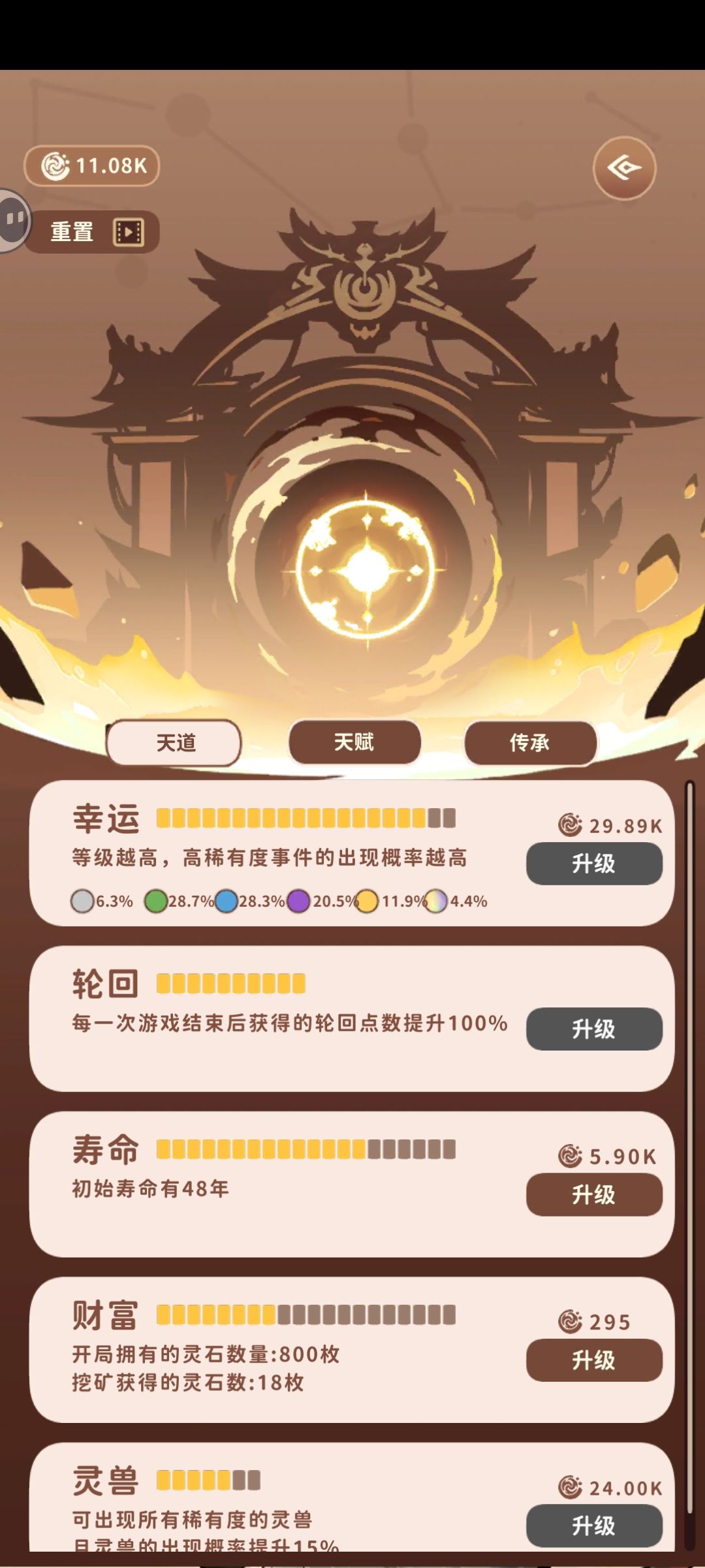 开局属性气感悟性拉满,视频广告加成一定要刷出修行速度20% ,剩下属性点战斗和魅力。(图四和图五是较为合适的开局) 然后传承选择真鬼谷刷出一个气运不算太低儒或者邪道友,词条选择加功法感悟品质的 然后游戏过程中最好前三个卡包有灵兽,帮助度过前期以及靠境界压制秒怪速通 境界压制的具体实施方法如图三,保证在第四个卡包出现时没突破(卡包里面的内容在出现时就决定了,这样可以保证比怪高两个小境界以上) 道