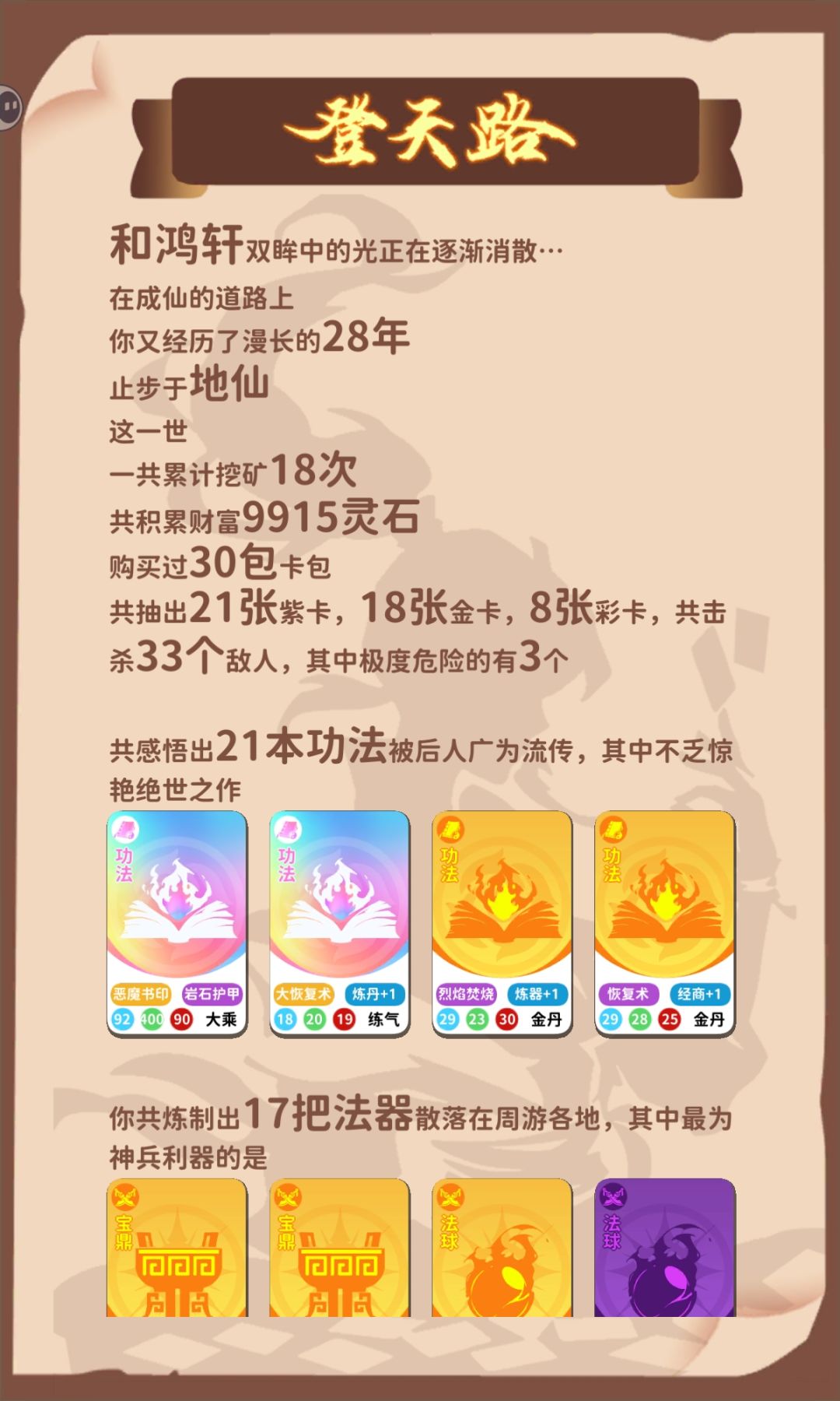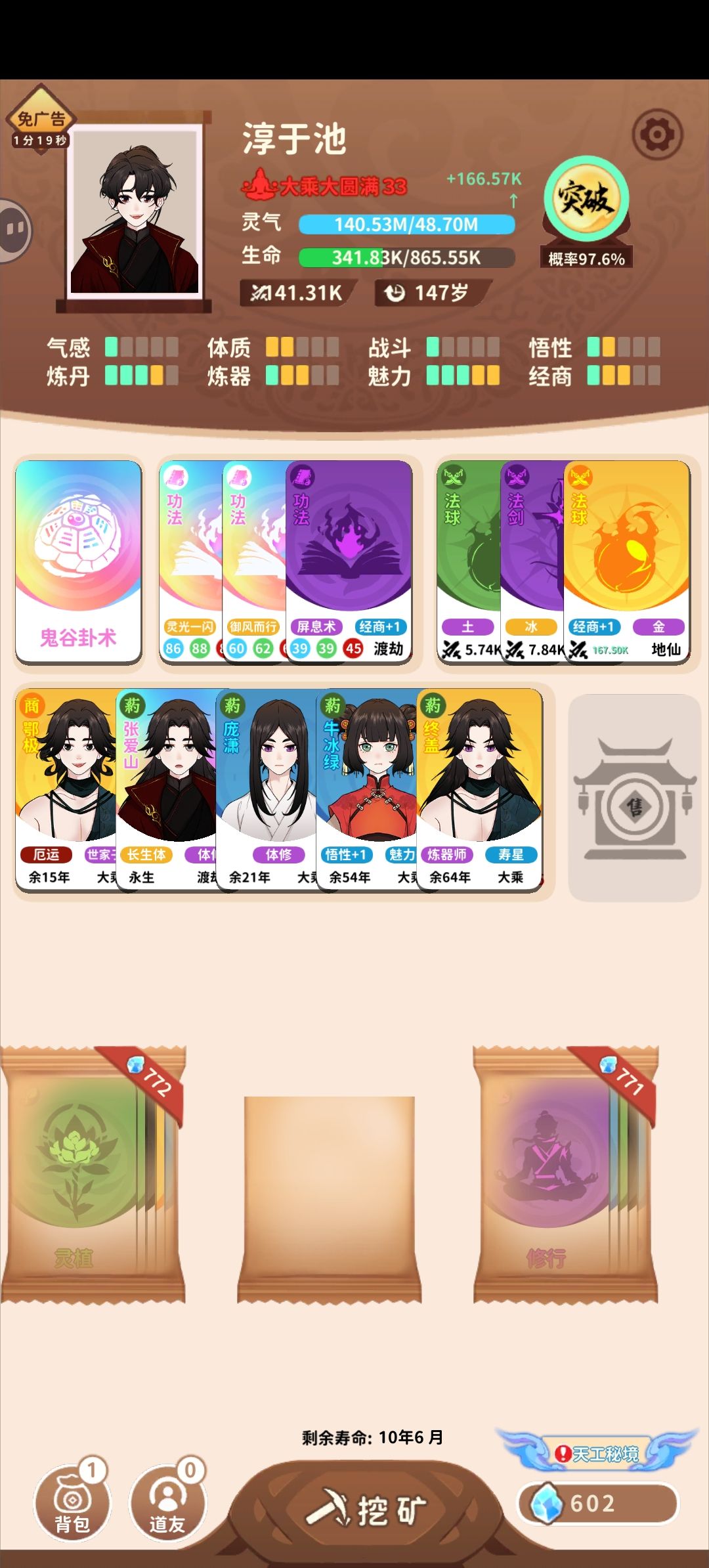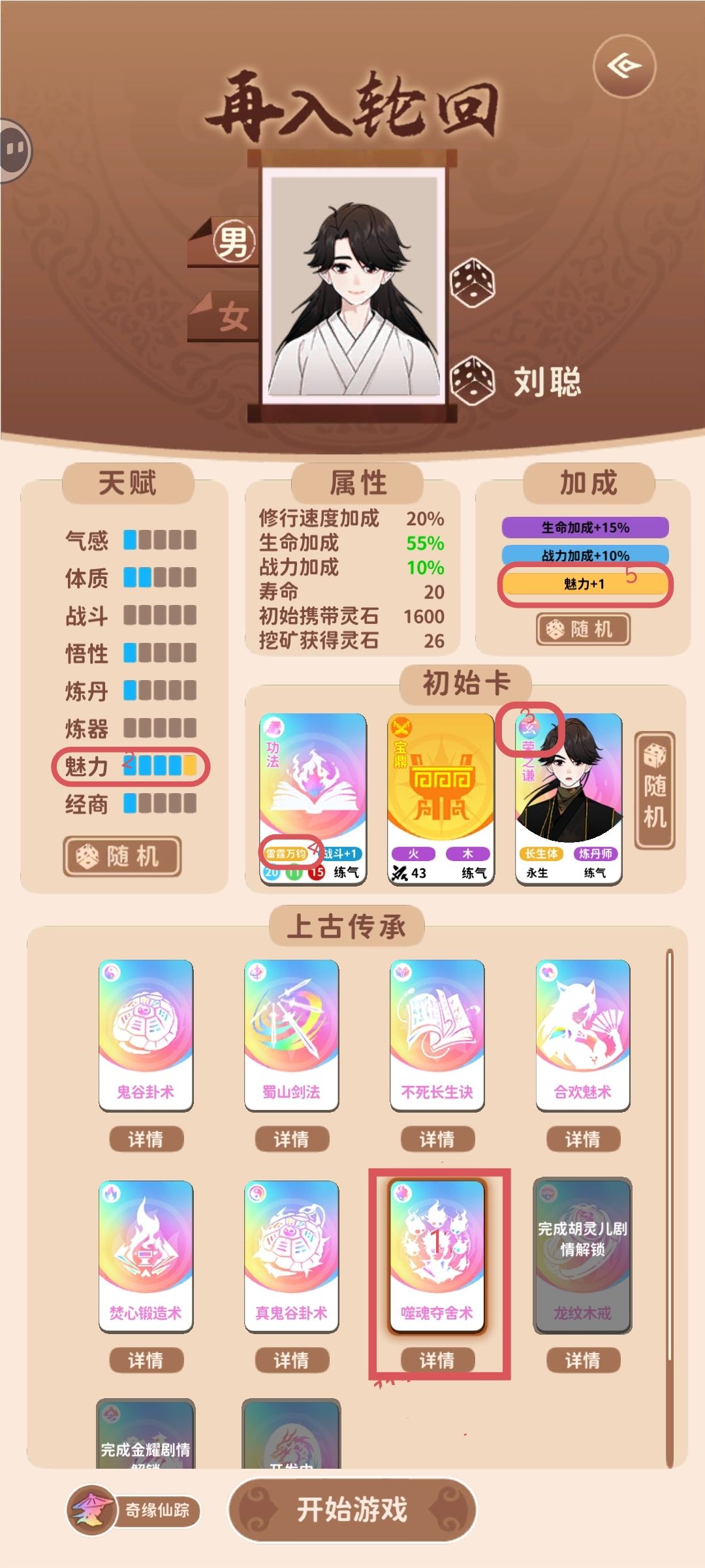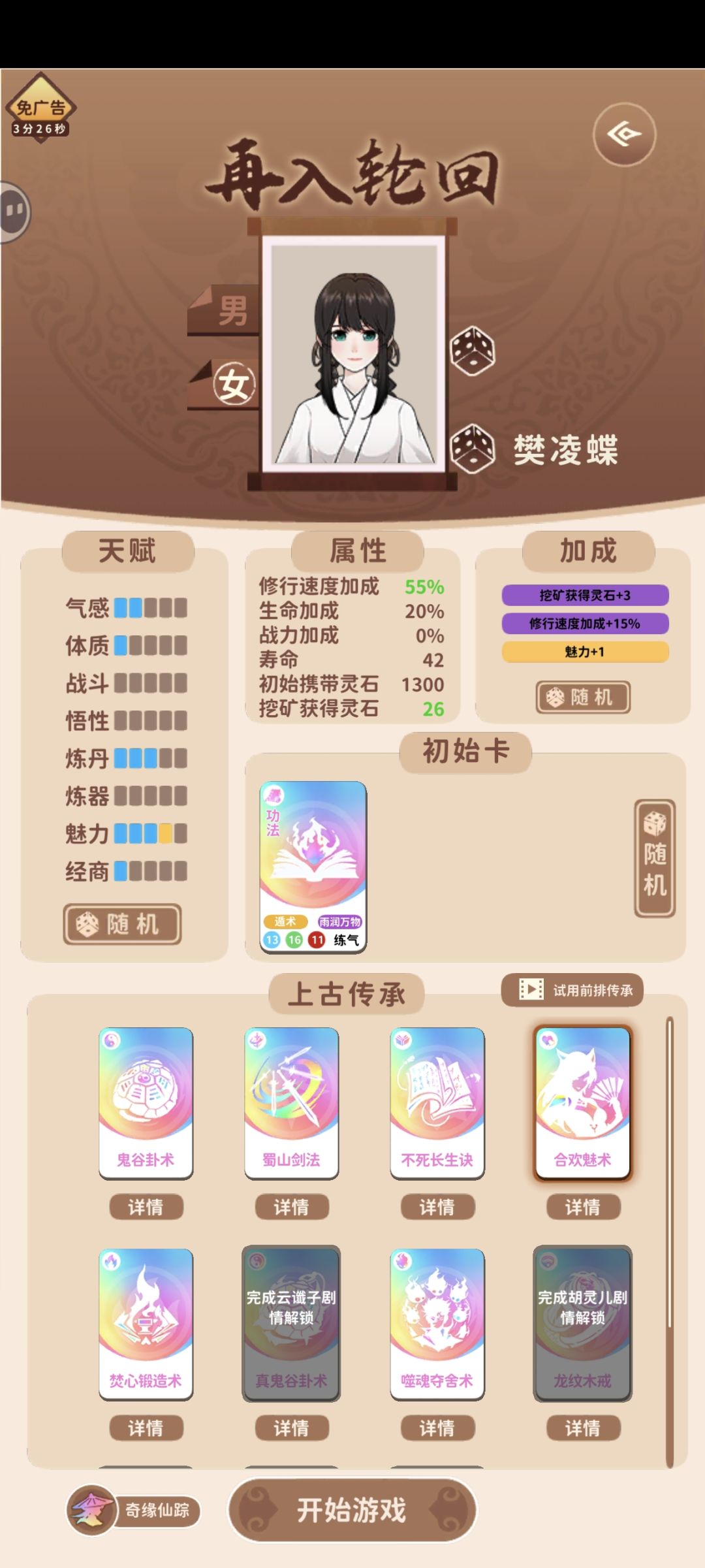 这个流派好处就是不用看太多广告,因为鬼谷卦术10个广告就可以开,前期可能无法登仙,但可以给没有玩法的小白使用,每一局多获得些轮回点。 炼丹流核心:开灵植炼丹药,不够的去商城买。 主要属性:经商,炼丹,次要属性:气感(加修炼)魅力(交朋友) 功法:建议锻体神术,没有可以锻体术,实在不行随便也可以 法宝随便带,朋友带灵药谷的,或者有世家子弟性质的 然后开局就抽卡,前面非常简单因为随便来个灵植基本都能让