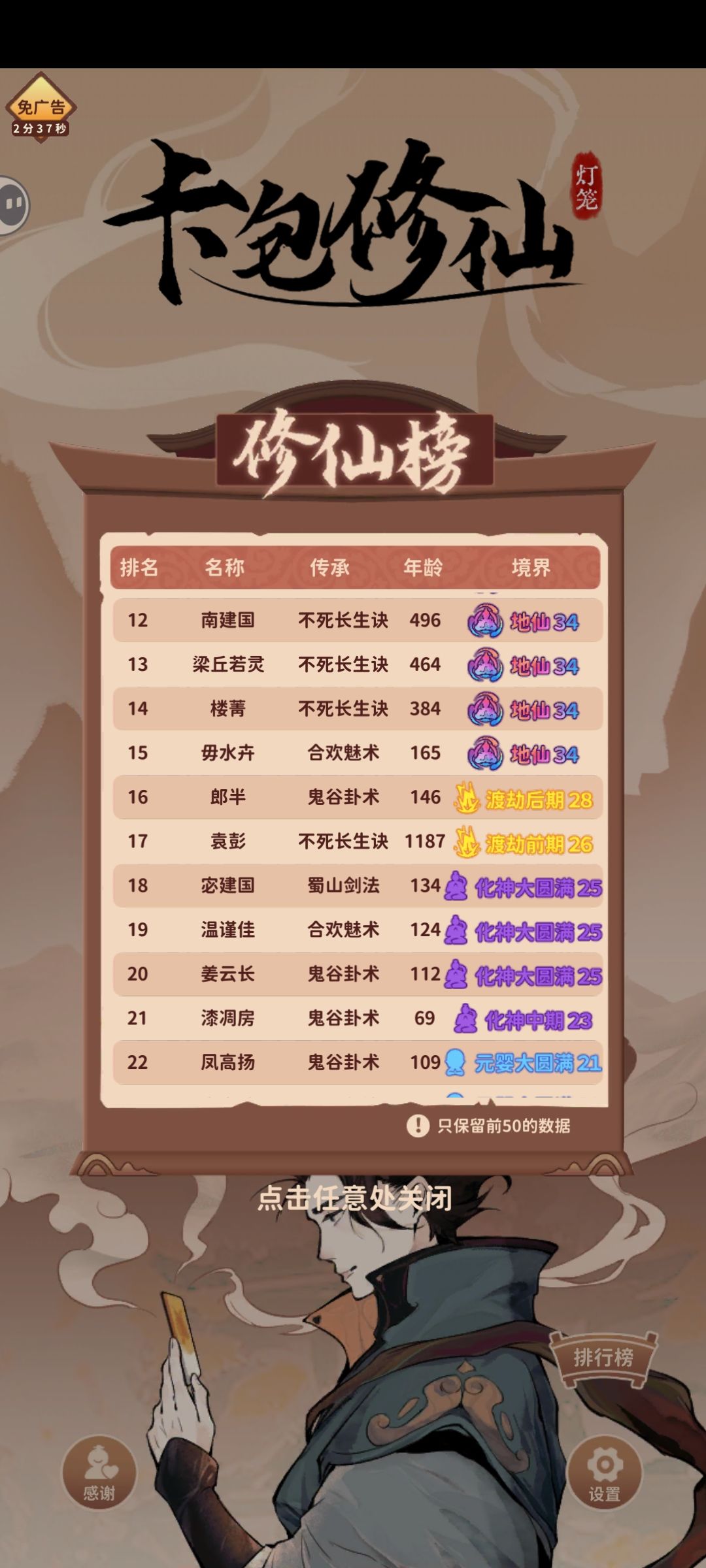 开局传承选长生,属性堆生命+开采灵石+经商,功法优先选恢复术+枯木逢春(没有两个功法槽位的需要先在星图里花100点数开),卡包只开商店买突破丹+广告卡包(可选),然后挂个连点器挖矿躺着飞升,无聊但简单。