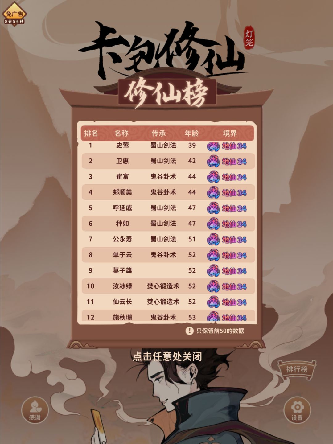 如图(旧版+新版世界榜+个人总榜),目前非SL我总榜最快的是蜀山,39; 鬼谷最快两次44; 长生最快136; 合欢最快52; 焚心最快是45; 真鬼谷最快是魔道44; 还有唯一一把无流派,直接搞了把52。 (存读档能无限刷卡包冲低概率,试了几次之后觉得太无聊,而且SL的上不了世界榜,没啥意思,这里就不展示了) 所有流派速通我都是靠丹药,也就是指高炼丹加药谷伙伴,只是要根据各流派的特点调整辅助策略