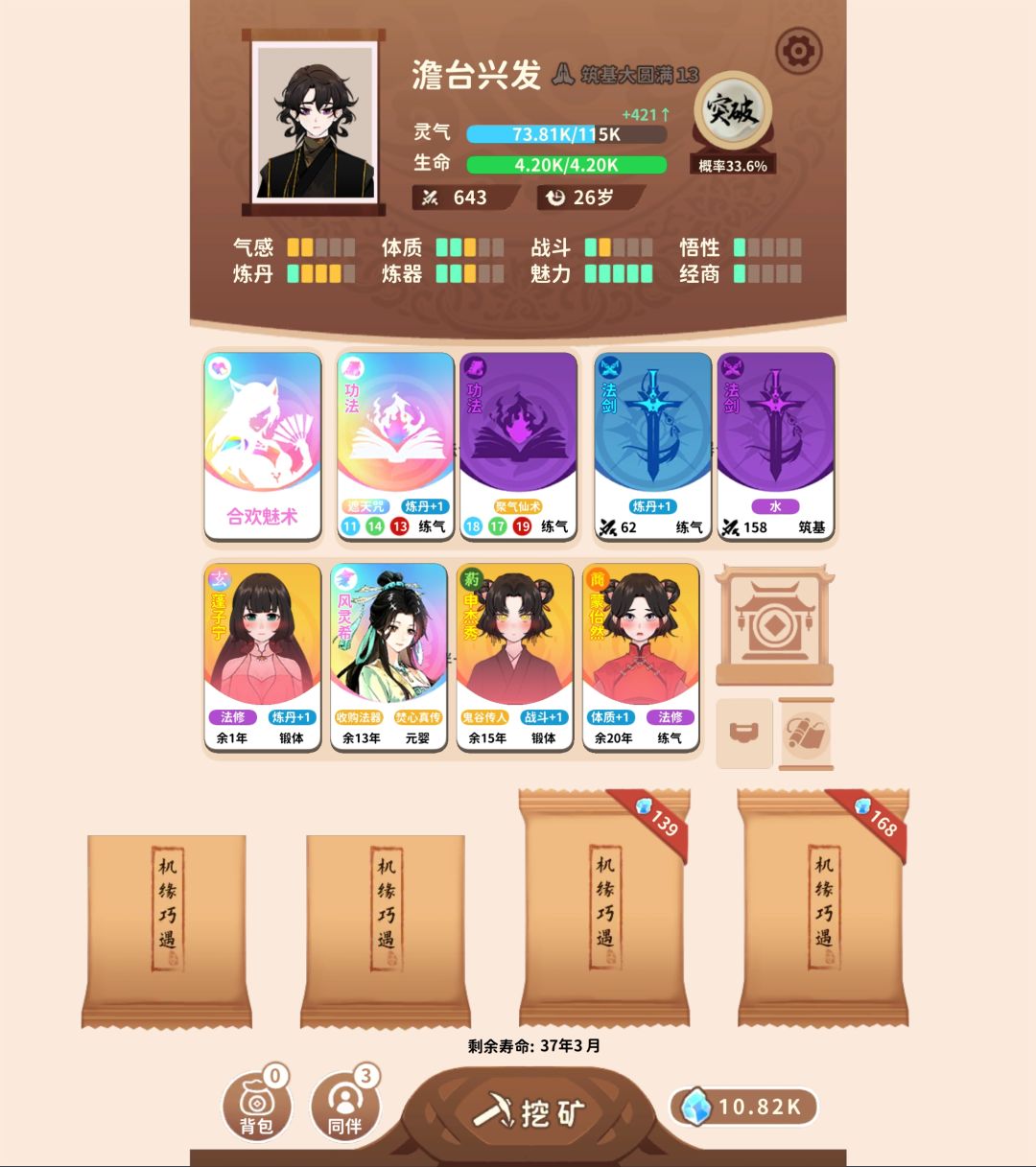 对应关系:灵石=游戏内基础金币 修行-气感,增加获得灵气 灵植-炼丹,增加突破概率 感悟-悟性,转化为功法进入背包 灵矿-炼器,转化为法器进入背包 体质+生命,战力+攻击, 魅力+招募伙伴概率,经商可以议价商店 (打折这个商店里可以拉进度往后看,一个界面只能放下四个,点打折会优先所在的这四个能看到的😃😃) 游戏里通关最重要的就是这个商店(宝阁盛会) 好东西都靠在这里买,经商每一点可以打折一次(最高