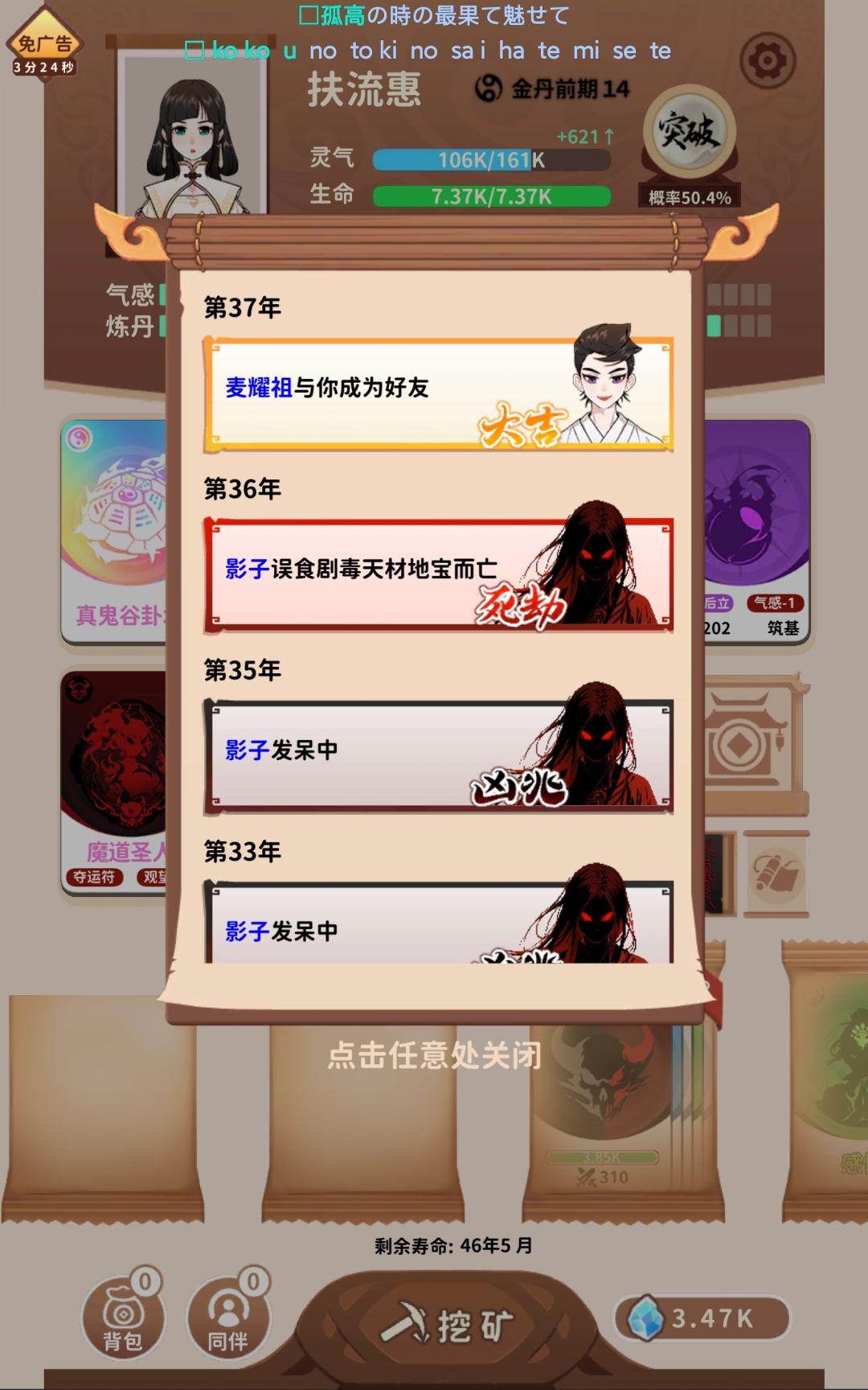 之前不知道为什么,正文部分没有更新,重新补上 反馈bug 1,如图2所示,无法对小伙伴进行操作,不知道原因,但是应该和长生诀容易卡出悬浮不可操作的卡片一个道理,一卡出这个必炸档 2,蜀山5格剑开启以后,如果属性条原本有1以上,装备有该属性增益的法器,卸掉数值装备以后,该属性词条不减,还是满值5 3,广告可能会看两次,且无法返回游戏 4,气感后面加好像没用,但是你开局时,气感每有1格,后面你的任何灵
