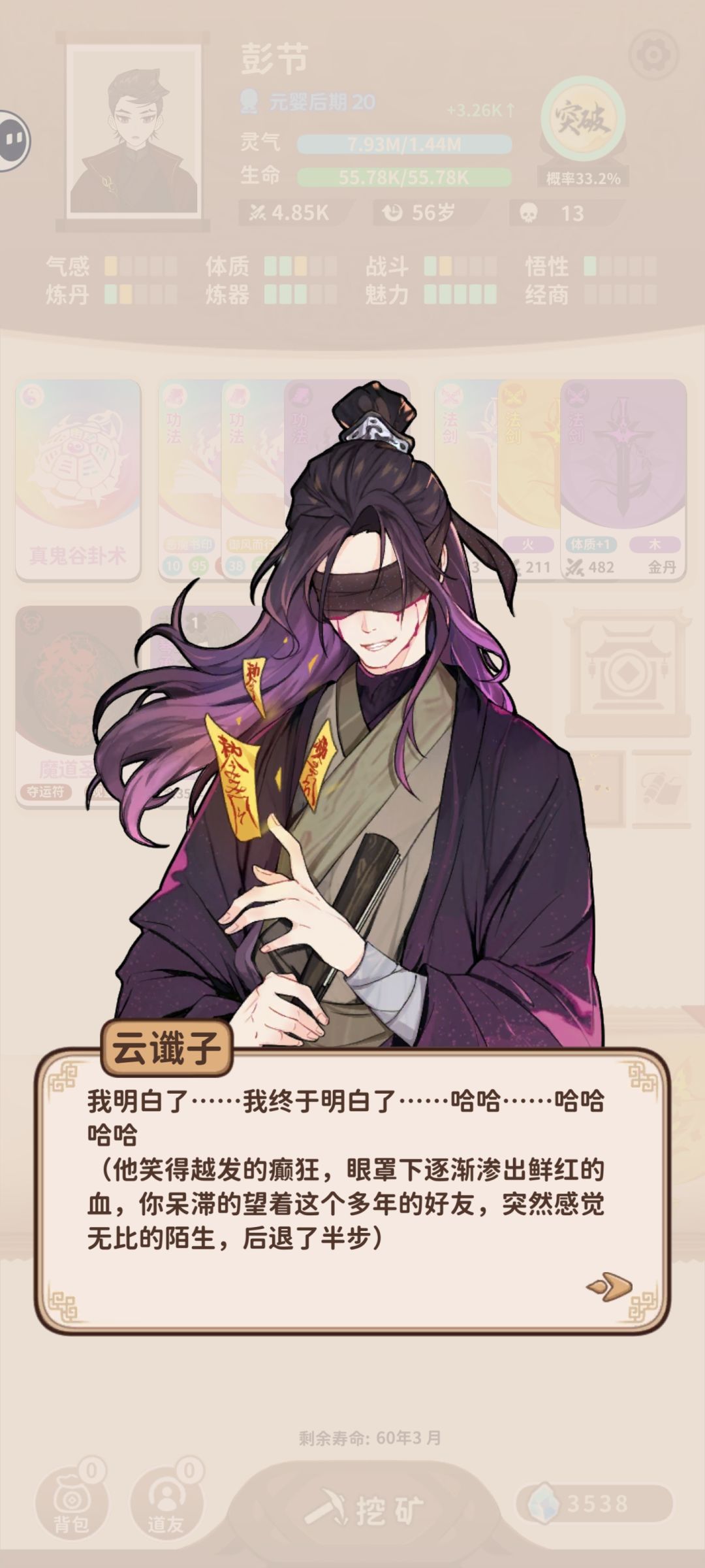 获取《真·鬼谷八卦》 1.点击再入轮回——左下角奇缘仙境,选中云谶子(高亮)后开始游戏 2.第一次相遇云谶子(紫衣人)全选第一个选项不救未来入魔的小孩 3.第二次相遇,选“与他何干”然后“救人”,云谶子入队成功 4.点击云谶子显示任务:结交两位满气运的道友既道友卡左上角气运数值为10的道友两次 5.完成结交任务后,云谶子离队时选择清酒或浊酒均可。 6.第三次相遇云谶子成圣,获得《真·鬼谷八卦》 云