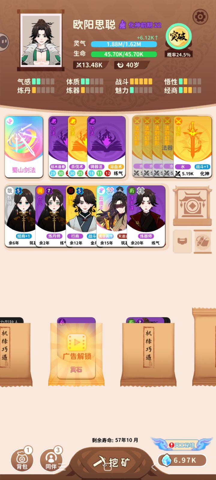 建议先看完真鬼谷卦术攻略。 传承要选真鬼谷卦术,刷魅力3~4点 伙伴刷新推荐如图二死劫(不用看气运)最好 伙伴卡左上角为气运,1点气运恶运次之 其他的运气什么的别要(这成就开局要让3个伙伴死然后就会变成魔道圣人)开局先不要突破等云谶子的第一次来 然后来到实力练气选择加一个伙伴(不喜欢看广告的可以不要)然后你的一点运气伙伴卡先不要丢 等他死加灵气(你有更好的伙伴品质,词条可丢,(粘人的