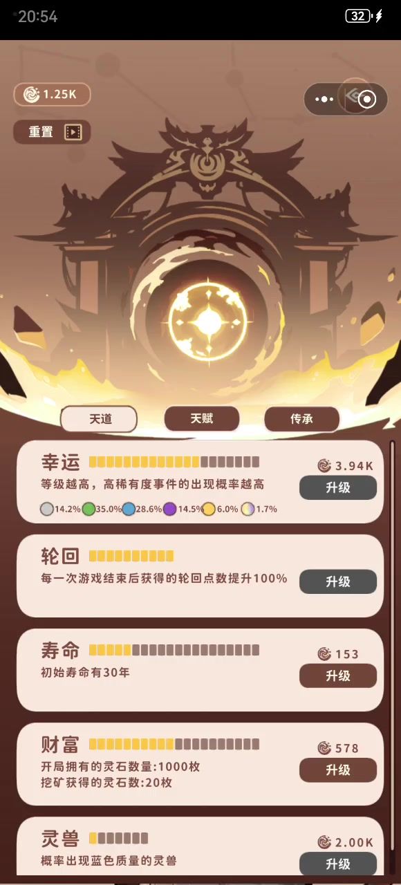 凭我对游戏52个小时的理解,新手最该做的是先升幸运。直到能够刷出彩色的卡牌为止,就是幸运下面那一栏,那个彩色圆圈有概率位置就行(记得把轮回先点满,再点幸运,轮回耗的不多,很快就能满) 然后直接刷焚心锻造术(乐知识:新手不会有完整长生诀,我52个钟才看了40个广告呢)广告给的功法里面除了鬼谷术,确实找不到比较好的 带了焚心以后,给本命法器吞噬法器的时候,注意看本命法器的颜色,不要喂低于他等级的,