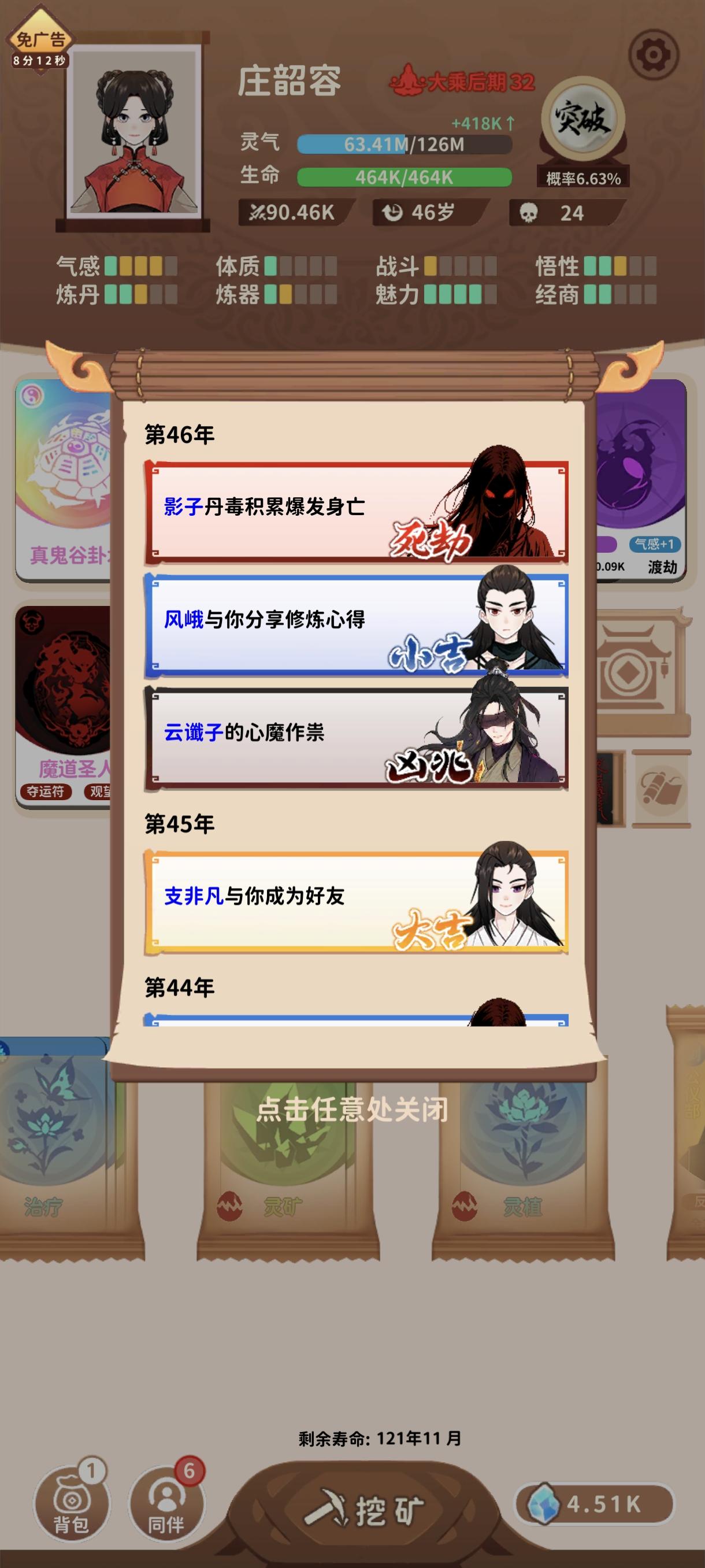 15岁结交了练气期的道友,一路跟着我从练气走到了化神,经过了22次境界提升,一直没有遇到自己的死劫,商贾出身,世家子弟,妥妥的主角模板啊,他的履历:21岁 炼丹炸炉38岁 神识受损42岁 炼器炸炉63岁 灵石被盗68岁 心魔87岁 灵石再次被盗118岁 武器爆了寿命用完之前我会一直看着这位道友能走到什么境界持续更新。。。。。