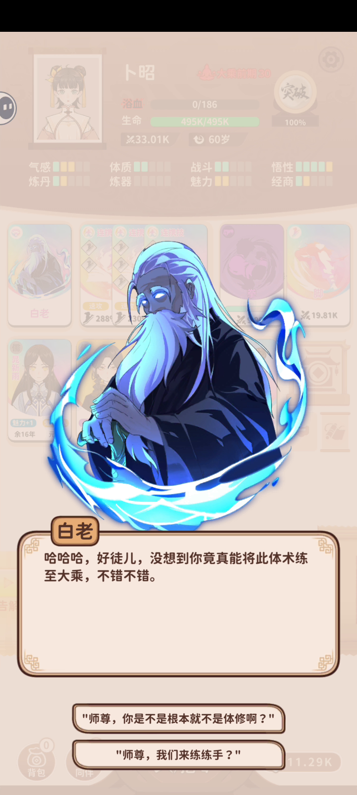 这局长生功法,17年遇到另一个长生体(是青梅!),并且交上了朋友(当时没注意看特性),然后一个久眠过后,朋友都去世了,只留下这位长生体,后面大乘飞升都舍不得走,想先让浦丹雪飞升,我想看到这个结局,是否会有一个彩蛋,是让长生功法的debuff(孤独感)消除,一个长生体遇到另一个长生体,然后永生功法的人飞升后可以在一起的结局啊,浦丹雪另一个特性是暖心(),每个月概率回血,我这局枯木逢春+
