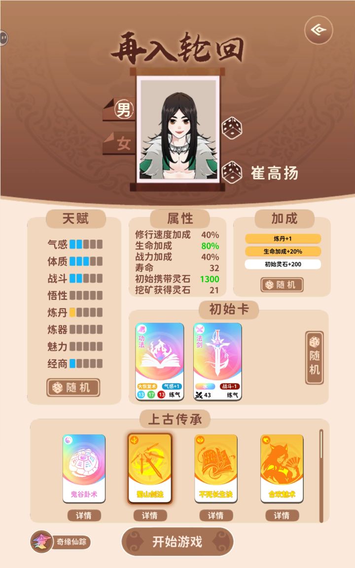 前言——目前通关两次,后续会尝试更多流派。第一次做小白攻略,不足的地方请见谅,很高兴我的攻略可以为你带来小小的帮助,自己去探索流派会更加有趣哦~欢迎补充----------------------------------------------------------------------------属性——气感:每一点提升20%修行速度(很重要)魅力:结交同伴时影响成功率(不要放跑超级